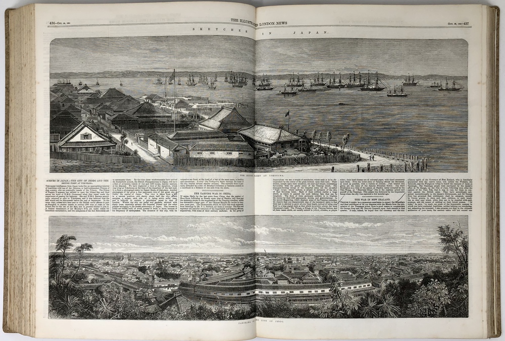 18. No.1285: Saturday, October 29, 1864. (pp.429-452)*日本速報記事(p.430) / 横浜湾に停泊する英艦隊と江戸市街図を描いた見開き大パノラマ図2枚を含む記事(p.436-437)