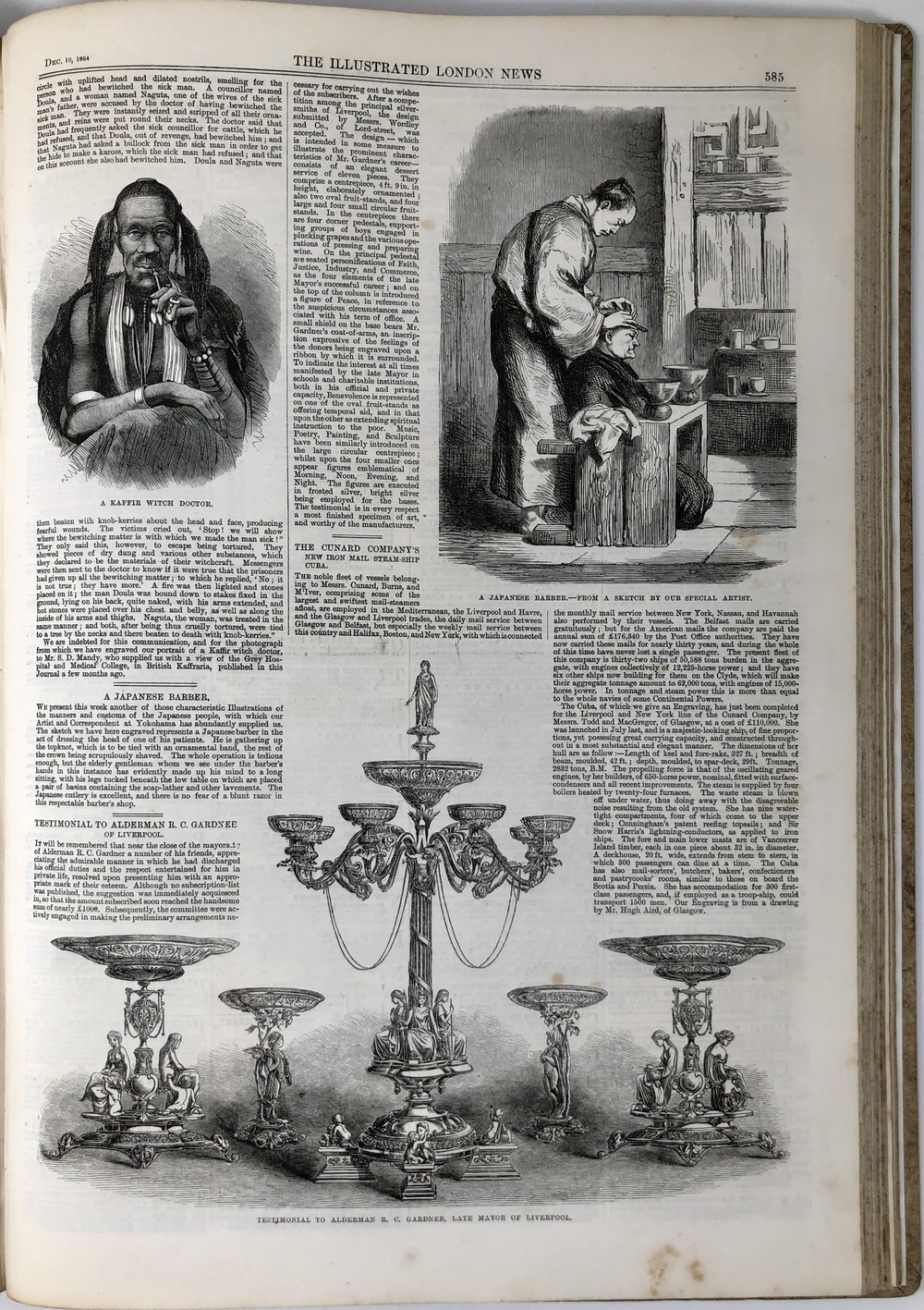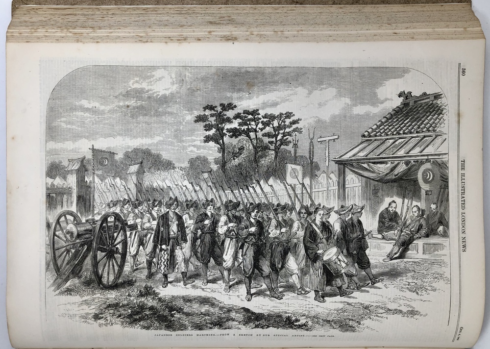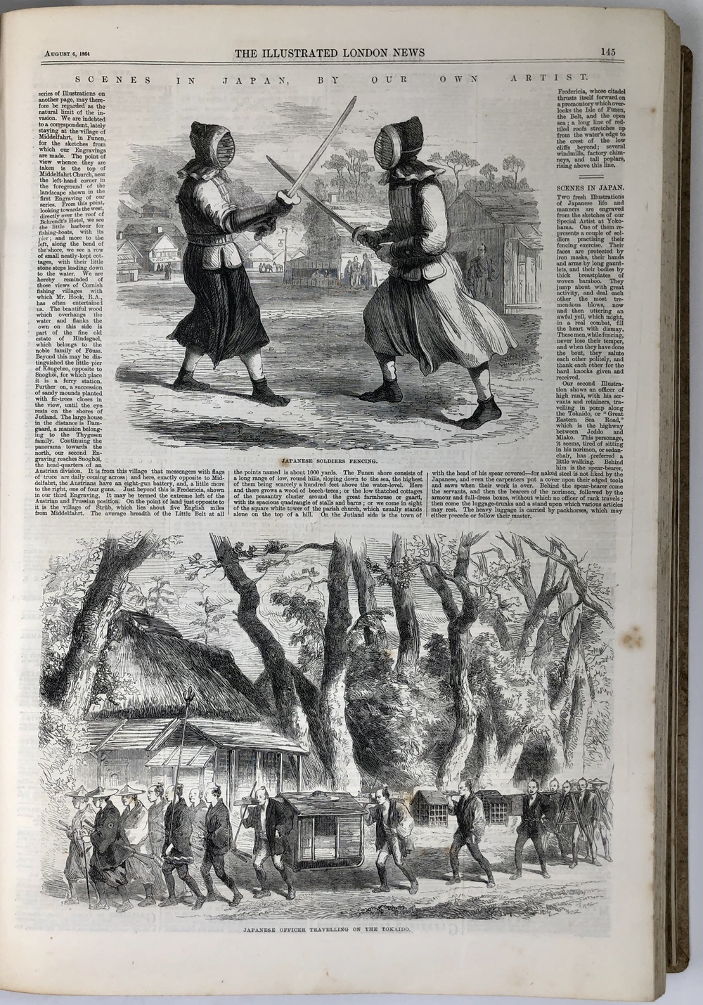 本書は、絵入り週刊誌の先駆けとして名高い『イラストレイテッド・ロンドン・ニュース』のうち、1864年6月から12月にかけて刊行された28号分を1冊にまとめて合冊したものです。1864年のイギリス・フランス・オランダ・アメリカの四国連合艦隊と長州藩との間で起きた下関戦争に関する挿絵入り記事をはじめとして、特派員ワーグマン(Charles Wirgman, 1832 – 1891)による日本関係記事が豊富に収録されており、同時代のイギリスで発行された最大手週刊誌における日本情報の伝播状況を理解する上で欠かせない文献資料です。