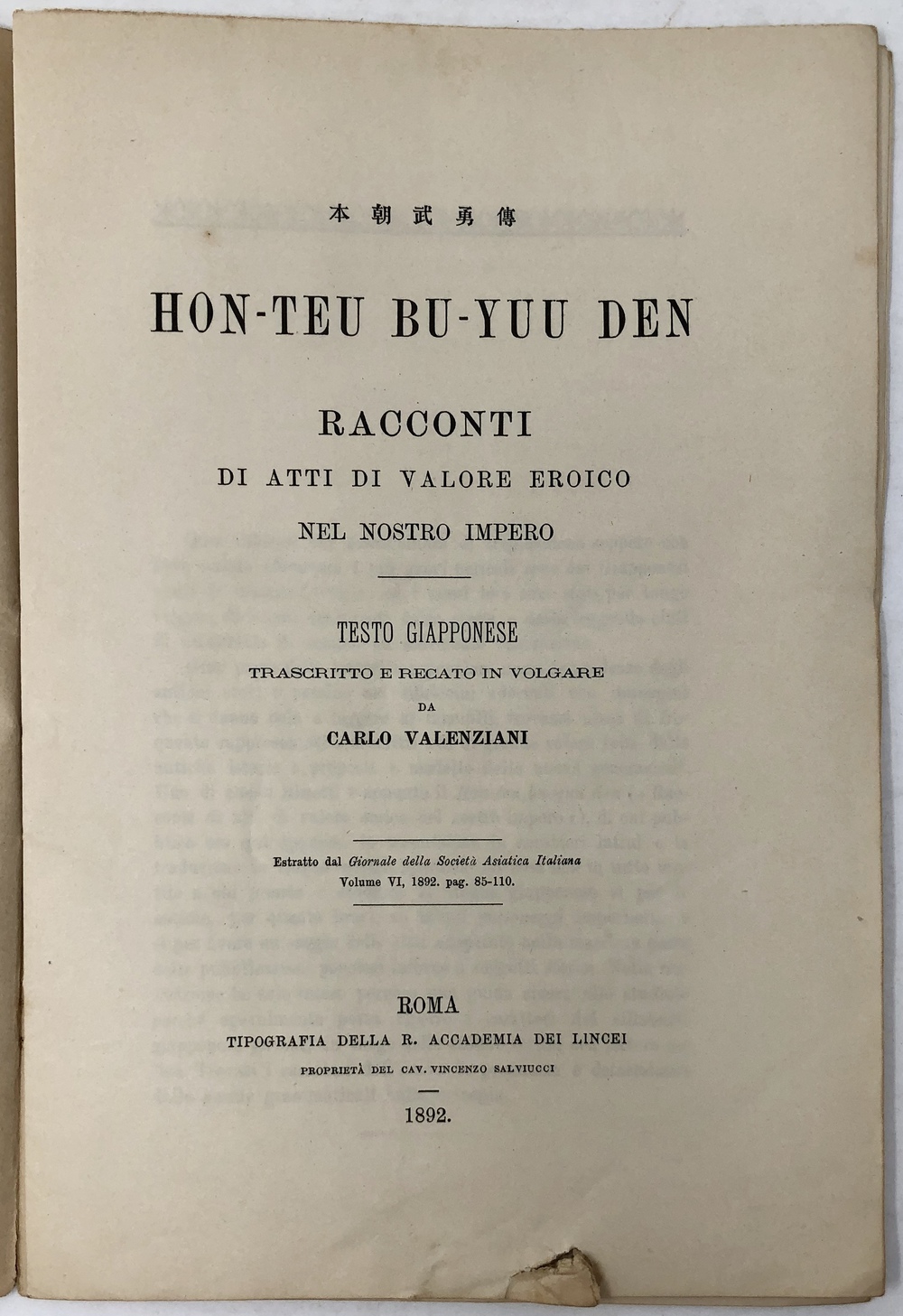 (イタリア・アジア協会雑誌第6号からの抜刷り) 1892年 ローマ刊
