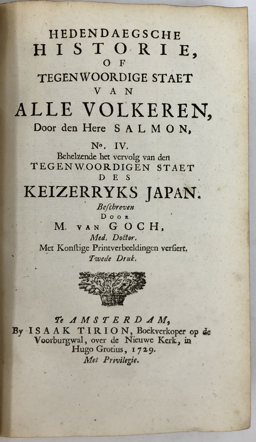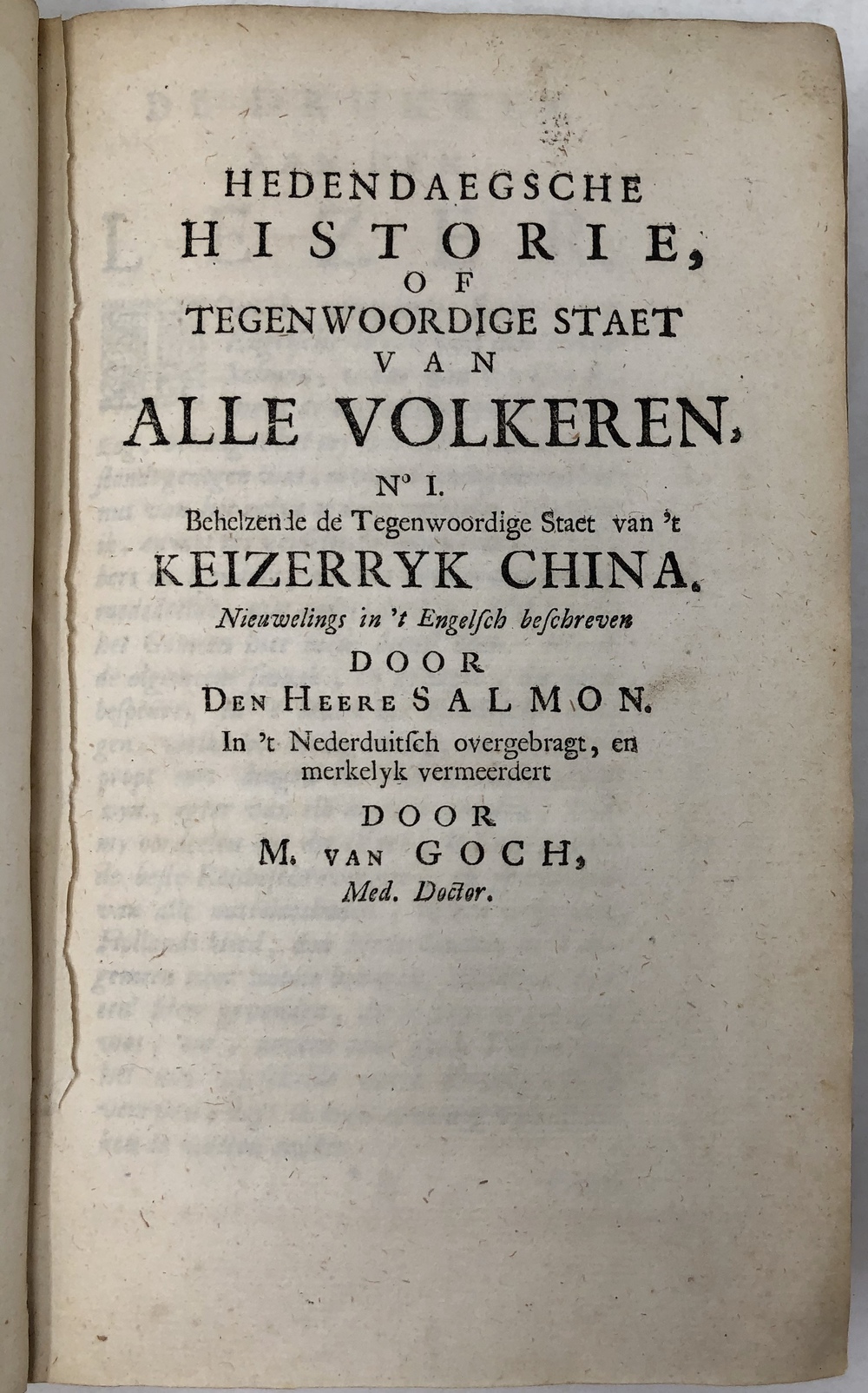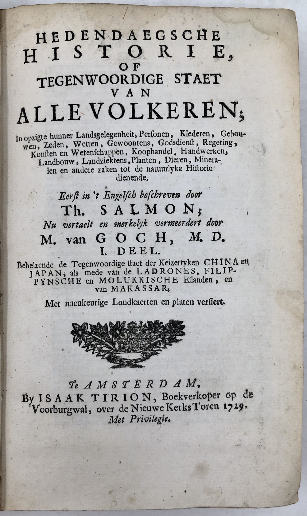 HEDENDAEGSCHE HISTORIE, OF TEGENWOORDIGE STAET VAN ALLE VOLKEREN;…Eerst in ’t Engels beschreven door Th. SALMON; nu vertelt en merkelijk vermeerdert door M.van GOCH, M. D. I. DEEL. Behelzende de Tegenwoordige staat der Keizerryken CHINA en JAPAN,…