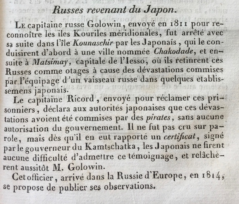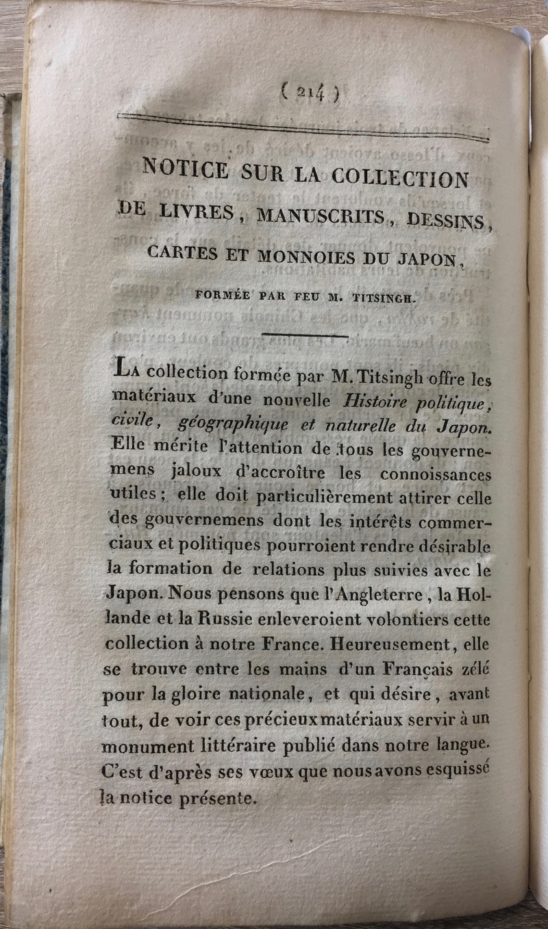 DESCRIPTIONS DE LA TERRE IESSO, TRADUITES DU JAPONAIS par feu M. TITSINGH, Ambassadeur hollan-dais au Japon. & NOTICE SUR LA COLLECTION DE LIVRES, MANUSCRITS, DESSINS, CARTES ET MONNOIES DU JAPON, FORMÉE PAR FEU M. TITSINGH. & Russes revenant du Japon.