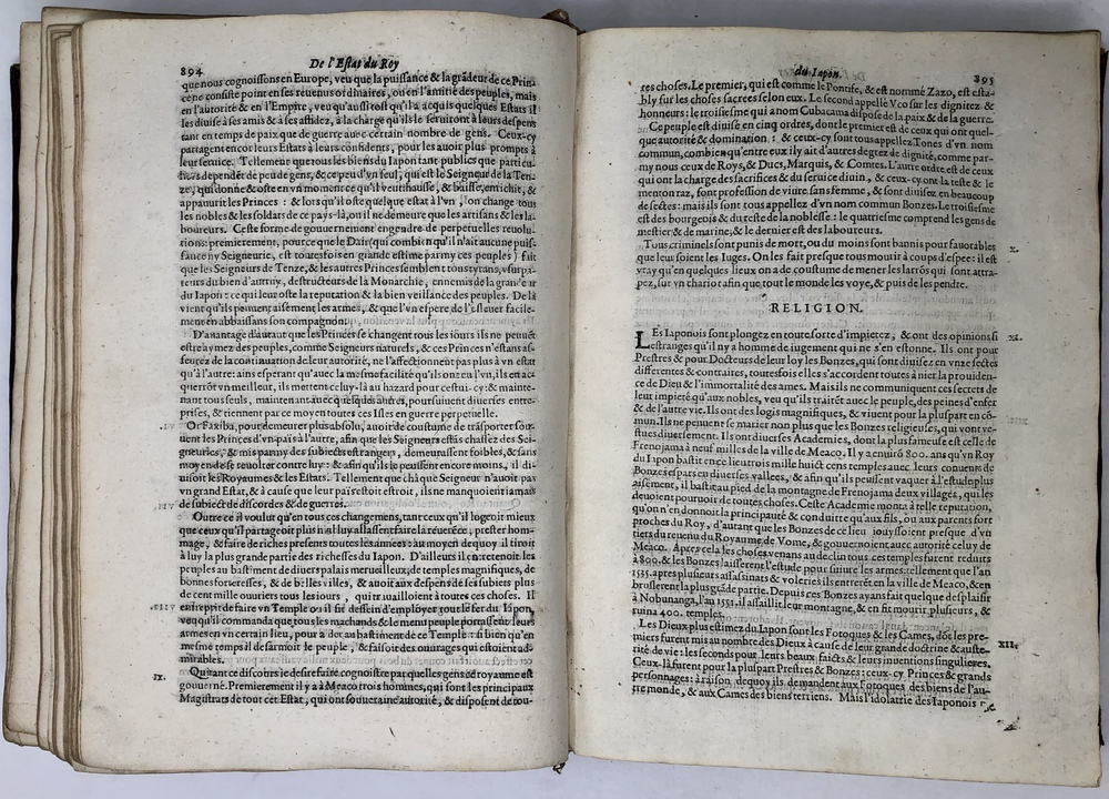 宗教事情については多くの紙幅を割いて解説されていて、坊主(Bonzes)と呼ばれる司祭を有し、その教えは11もの異なるセクトに分かれているが、皆それらは、神の存在と魂の不滅を否定する点で共通していると述べています。坊主は高貴な人々のみに教えを説き、一般の民衆のことなど放棄していること、数多くの大学を有し、中でも最も有名なものは日枝の山(Frenojama、比叡山のこと)という京(Meaco)の近くにあるもので、800年以上の昔から3800もの寺院があり名声を博していたが、京での内乱が勃発して以降は荒廃し、1551年(1571年の誤りか?)に信長(Nobunanga)によって破壊されたことなどが説明されています。日本の神々は、仏(Fotoques)と神(Cames)、阿弥陀(Amide)、釈迦(Xqaue)であることや、日本で信仰されている様々な悪魔の容態についても解説されています。また、こうした偶像崇拝のなかにあって、キリスト教の教えが広まっており、その信仰心はヨーロッパ人を上回っているとも述べられていて、簡単に日本におけるキリスト教の広まりに関する歴史にも言及していて、太閤様(Taicosama)による迫害に遭っても、その信仰心はなお真正なもので、日本各地で広がりを見せていることが解説されています。