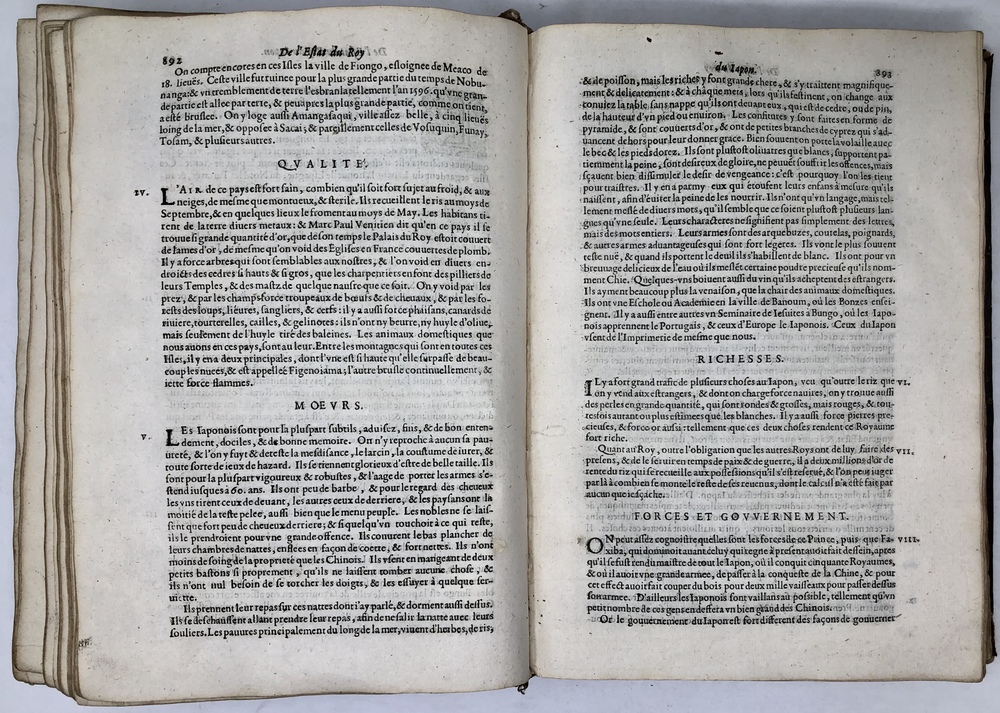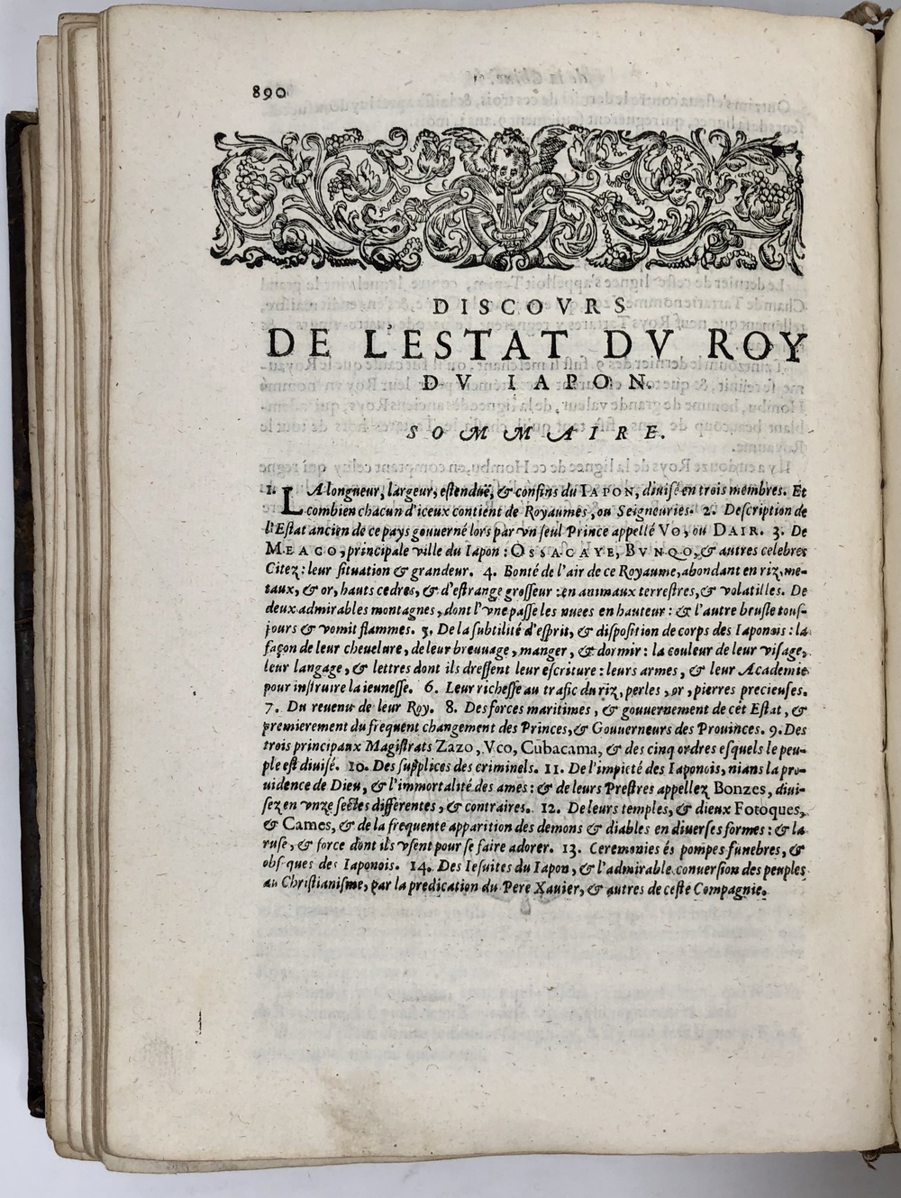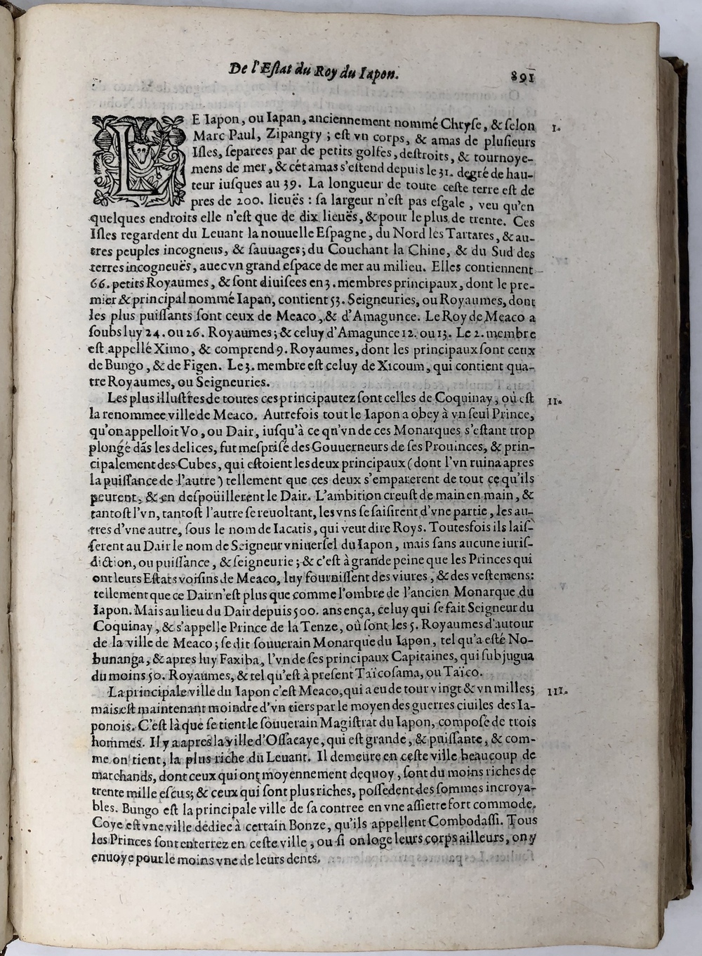 日本についての記述は、890頁から独自の章を設けて掲載されています。まず、日本の名称と地理構成についての解説から始まっており、マルコ・ポーロによって「ジパング(Zipangry)」と呼ばれてきたことや、海を挟んで中国の西方に位置する数多くの島々からなる国であることが説明されています。そのうち主要な島が3つあり、66の国々で構成されていること、第一の主要な島は、日本(Iapon)と呼ばれ、最大の都市である京(Meaco)と山口(Amagunce)があること、第二の主要な島は、下(Ximo、九州のこと)と呼ばれ、豊後(Bungo)、肥前(Figen)があること、第三の主要な島は、四国(Xicoum)と呼ばれる、などと、かなり具体的な解説がなされています。日本における主要地域は、京(Meaco)のある五畿内(Coquina)で、内裏(Dair)とよばれる王が住んでいること、しかし内裏の権力は他の諸侯によって長らく形骸化されており、近年では信長(Nubunanga)、彼の後を襲った羽柴(Faxiba)によって支配されていることなどが続いて説明されていて、地理的説明と同時に日本の歴史についても言及されています。