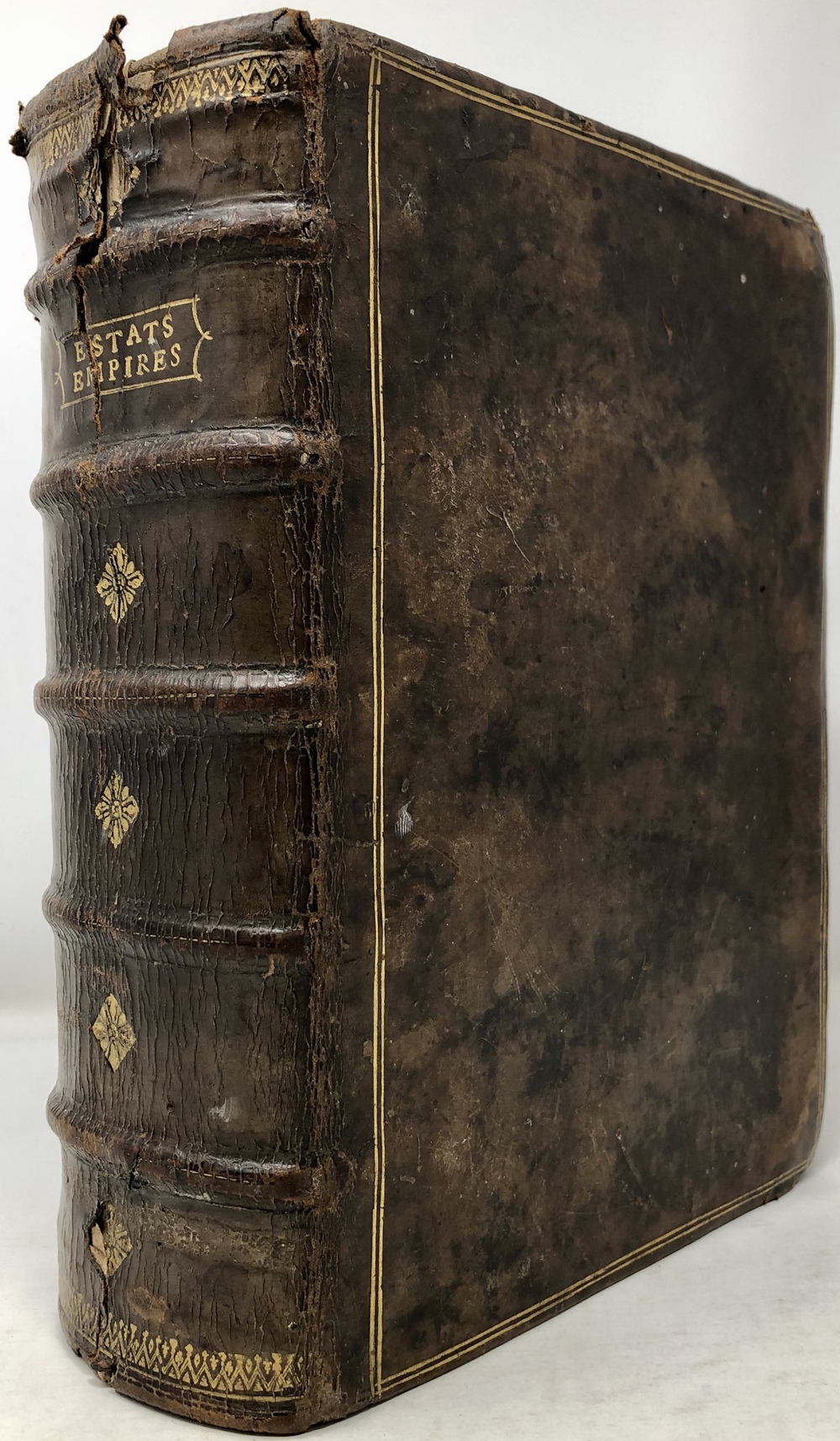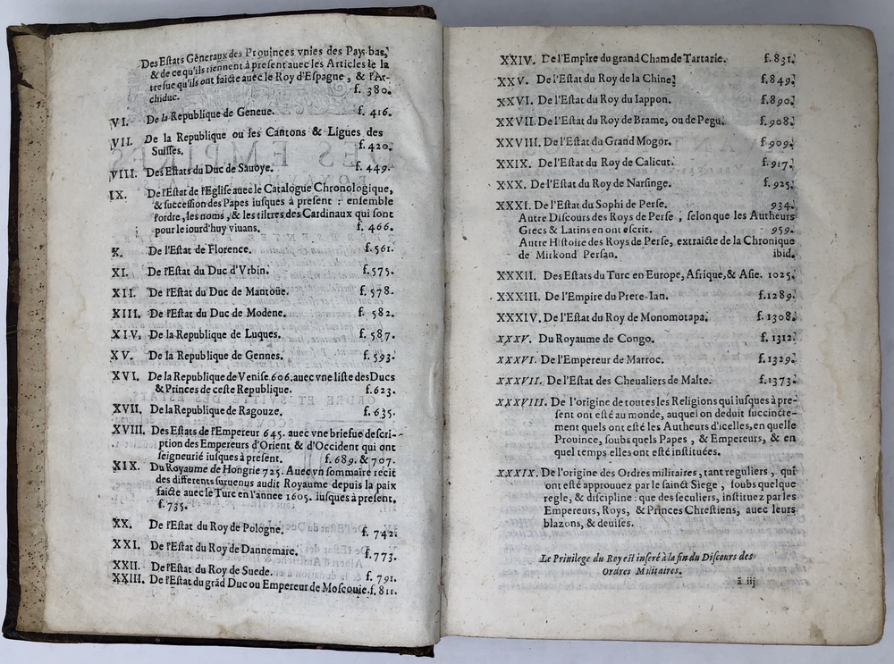 ダヴィティは、フランス名家の出身で、イエズス会の神学校で学び、詩作に秀でる傍らで軍人としても活躍しており、ヨーロッパ各地で要職を歴任しました。軍人としてのキャリアを重ねながら著作活動も継続して行っていて、そうしなた中で著された彼の代表作が本書にあたります。ダヴィティはフランスの地理や歴史を簡潔、且つ可能な限り網羅的に扱った著作を計画し、それと同時にヨーロッパ各国、そしてアジア、アメリカ、アフリカ諸国を同様に記述することを目論み、1,500ページ近くに及ぶ本書を書き上げました。副題が示しているように、各国地域の地理、人々の文化・風習、富(経済状況)、政治機構、王侯貴族の構成、軍事機構といった様々な角度から、当時ヨーロッパ人が知ることができた世界の情報を網羅的に収集、記述しています。