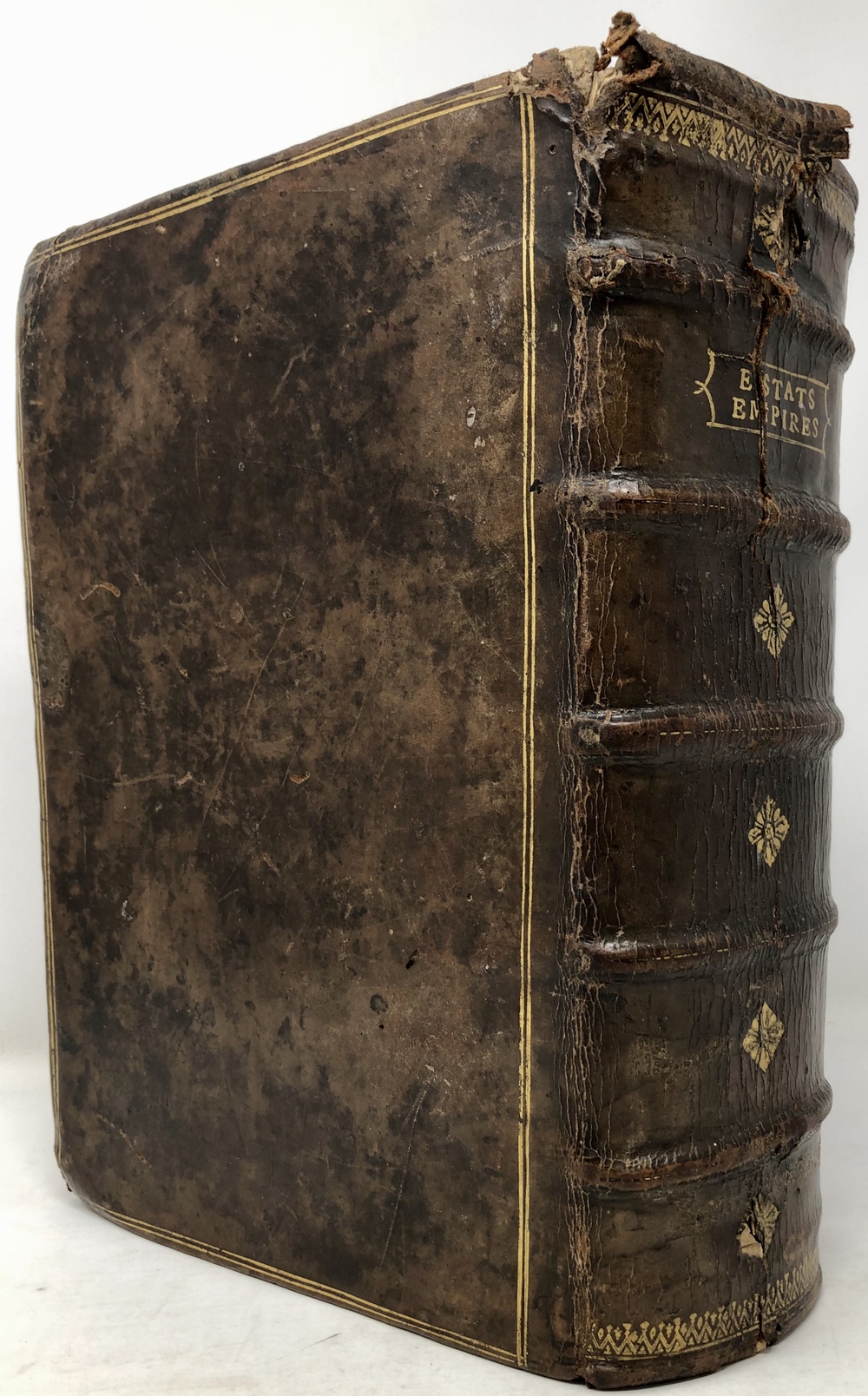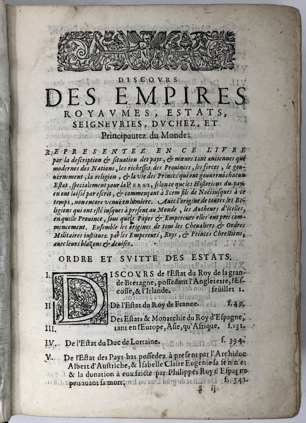 本書は、フランスの軍人、著作家であるダヴィティ(Pierre D’Avity, 1573 - 1635)による、17世紀初頭のヨーロッパを代表する「世界誌」です。ヨーロッパ諸国をはじめとして、日本を含むアジア諸国、アメリカ、アフリカを対象とした、当時急速に拡大しつつあった世界各地の情報を網羅的に主録した文献です。フランスにおける初期の日本情報源として、貴重な記事が収録されているだけでなく、ヨーロッパ人にとって当時知りうることのできた他の世界各地に関する記述と並んで掲載されていることから、当時の相対的な日本認識の様相を伝えている興味深い文献となっています。ダヴィティの『世界帝国誌』は、1613年の初版刊行直後から大変な人気を博したようで、増補改訂版が繰り返し出版され、他言語にも翻訳されていますが、本書は1625年にルーアンで刊行されたものです。このルーアン初版本は、本書の性質を理解する上で重要となる初版とほぼ同じを意匠に富んだタイトルページを採用し、構成も初版に準じていることから、後年の増補改訂版では把握が難しくなっている、刊行当時の姿を伝える貴重な版と言えるものです。