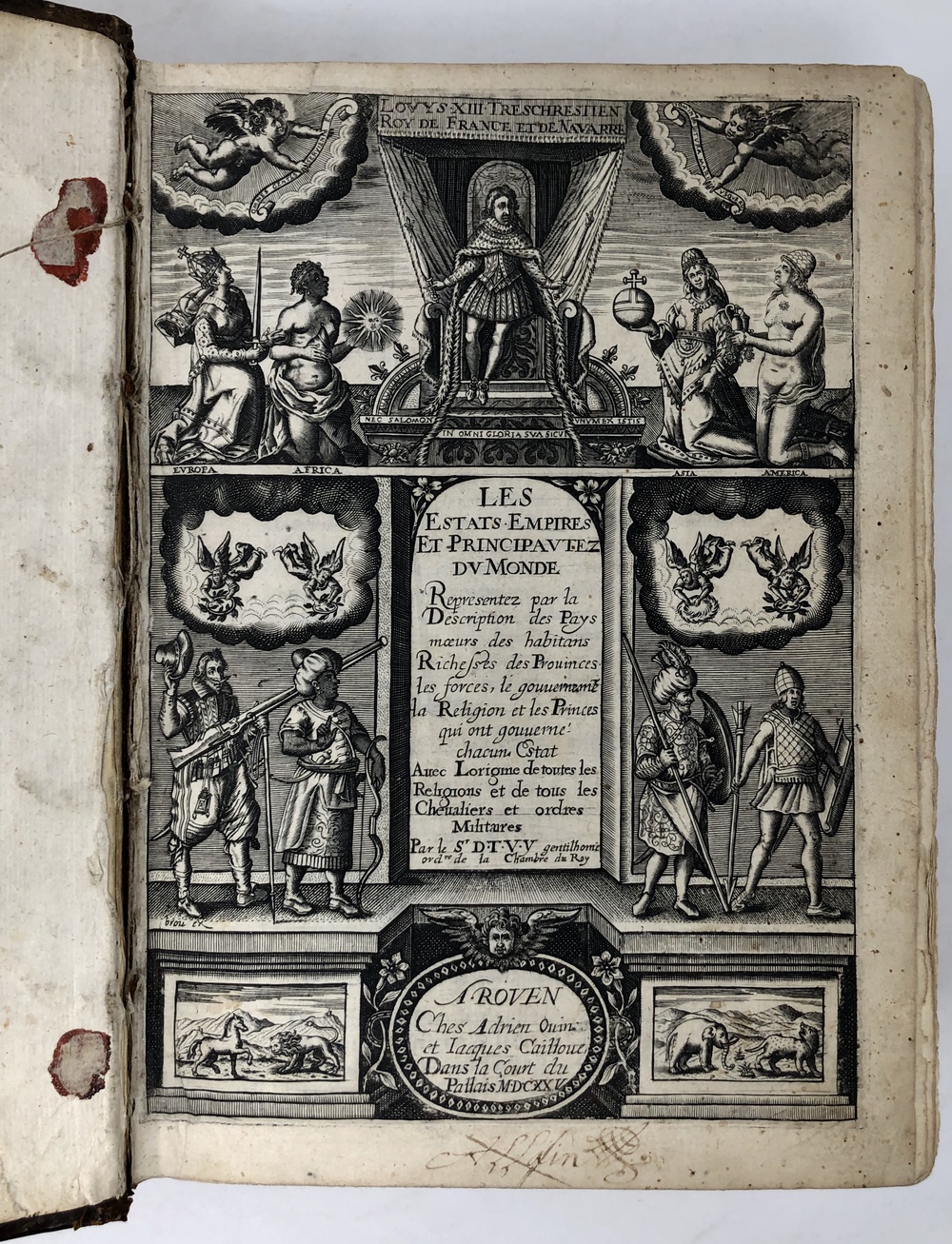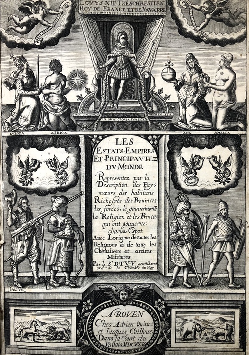 アジア、アフリカ、アメリカ、ヨーロッパを象徴した4人がルイ13世に跪いている様を最上部に描いた本書のタイトルページは、大航海時代が進むにつれて急速に発展したヨーロッパ人の世界観、しかもそれらがフランス王の下に服するのだという鮮烈な印象を見る者に与えています。このタイトルページは、後年になって刊行された増補改訂版では異なる意匠に変えられていたり、より簡素なものに変更されていることから、初版に準じた意匠を採っている本書のタイトルページは、本書の元来の性質と目的を端的に表象しているタイトルページとして、非常に重要と思われます。ちなみに、このタイトルページは、同じ構成を採りながら、ルイ13世の代わりに、イエズス会を象徴するIHSの文字を配した版(1614年サントメール版)や、チャールズ1世を描いた版(1615年英訳版)などがあるようです。