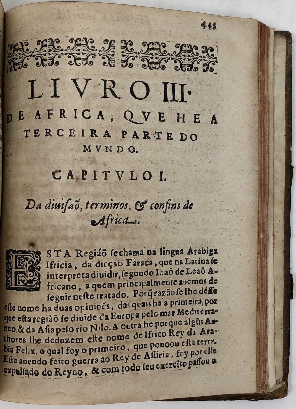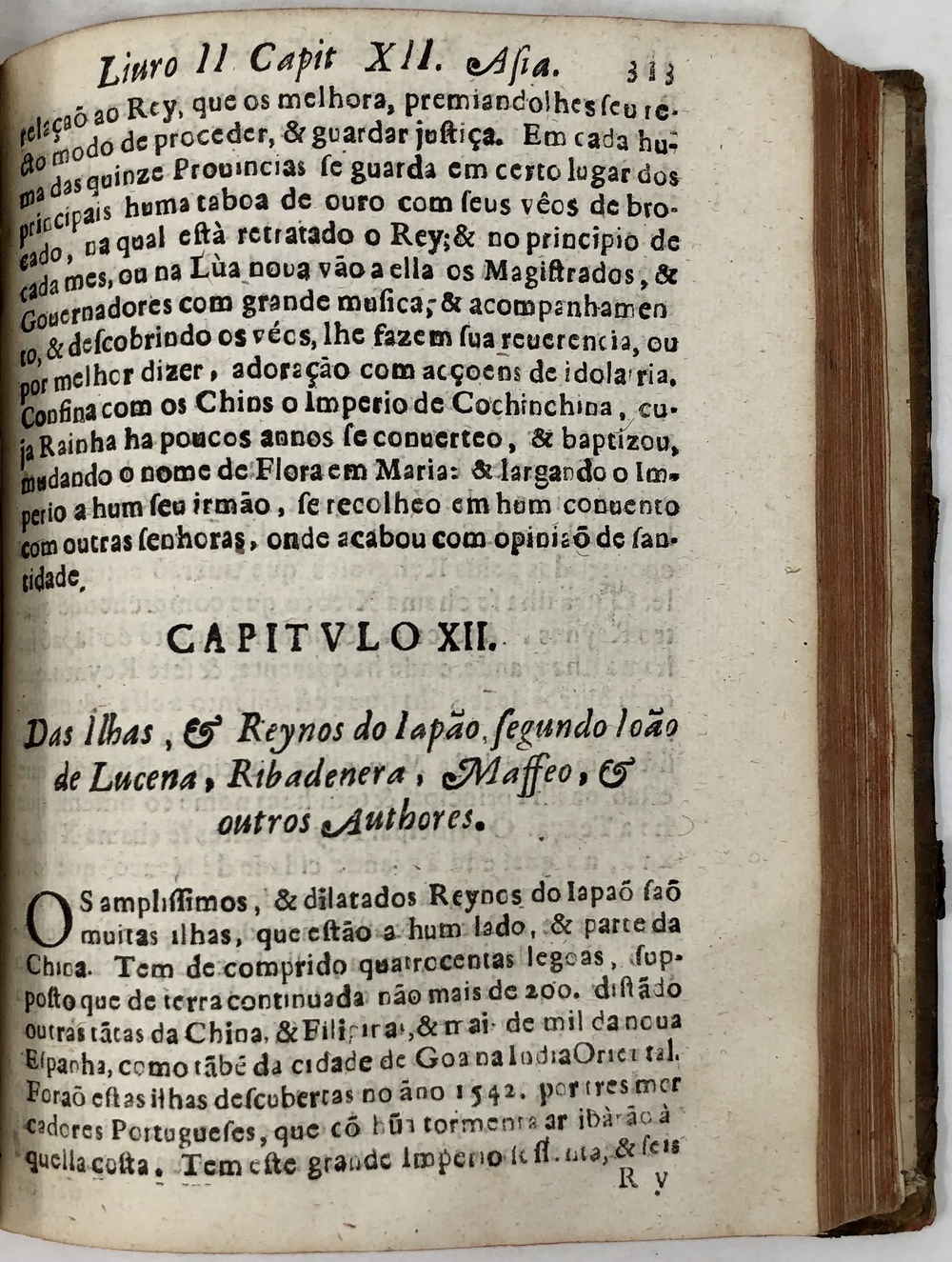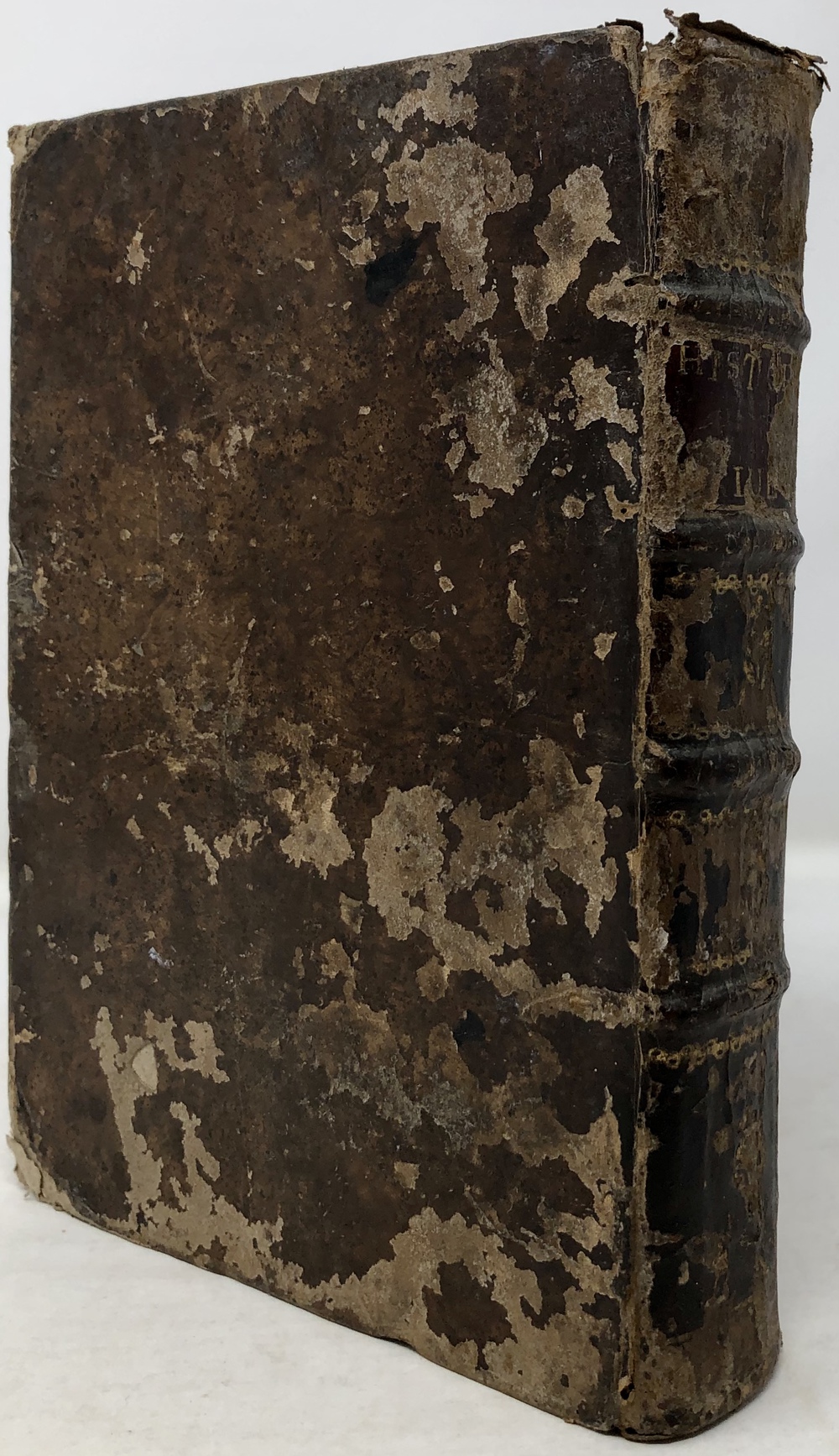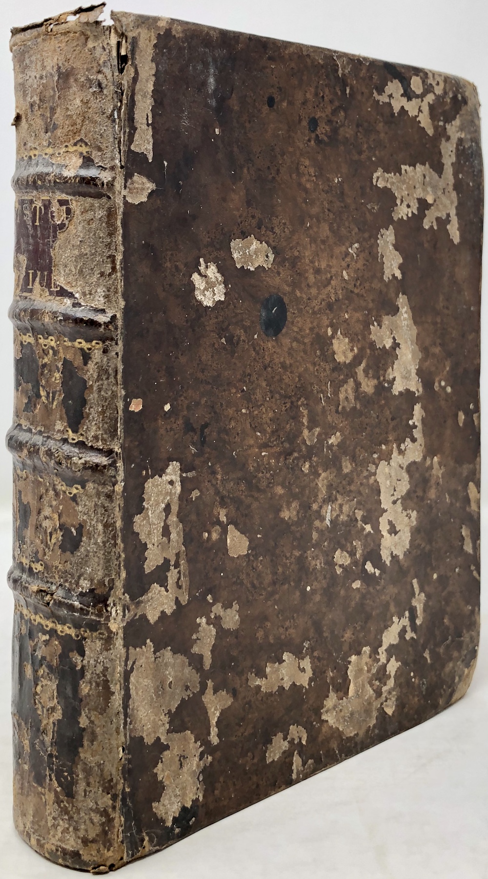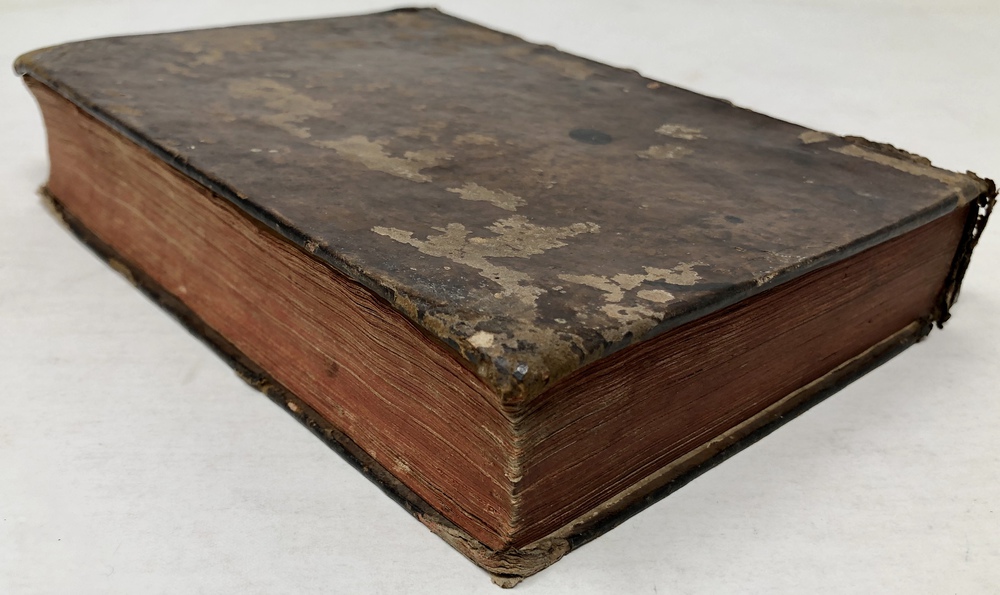 18世紀ごろのものと思われる革製本で、背と表紙部分に革の剥離や痛みあり。本文の状態は概ね良好といえる。小口は三方とも赤く染められている。