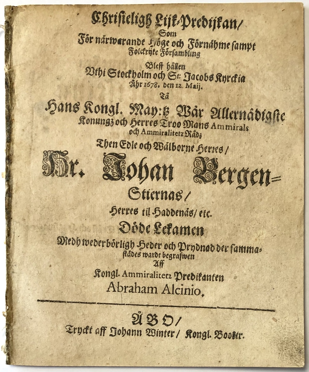 Christelijk Lijk=Predijkan / Som För närwarande Höde och Förnähme sampt Fockrijke Försambling Bleff hållen Vthi Stockholm och St: Jacob Kyrka Åhr 1678. Den 12. Maij. Tå…Hen Edle och Wälborne Herres / Hr. Johan Bergen=Stiernas /…