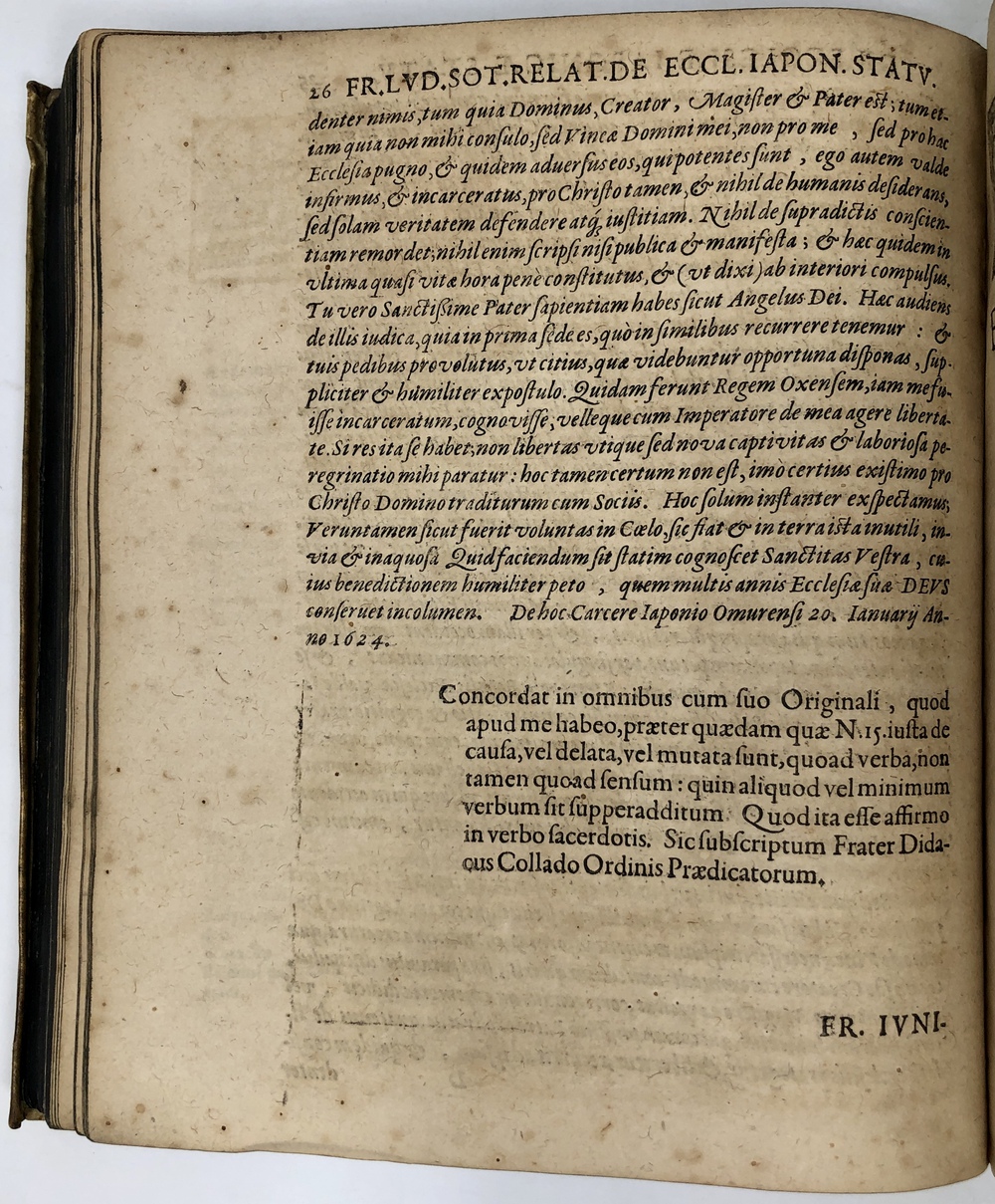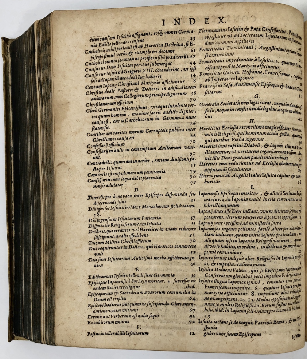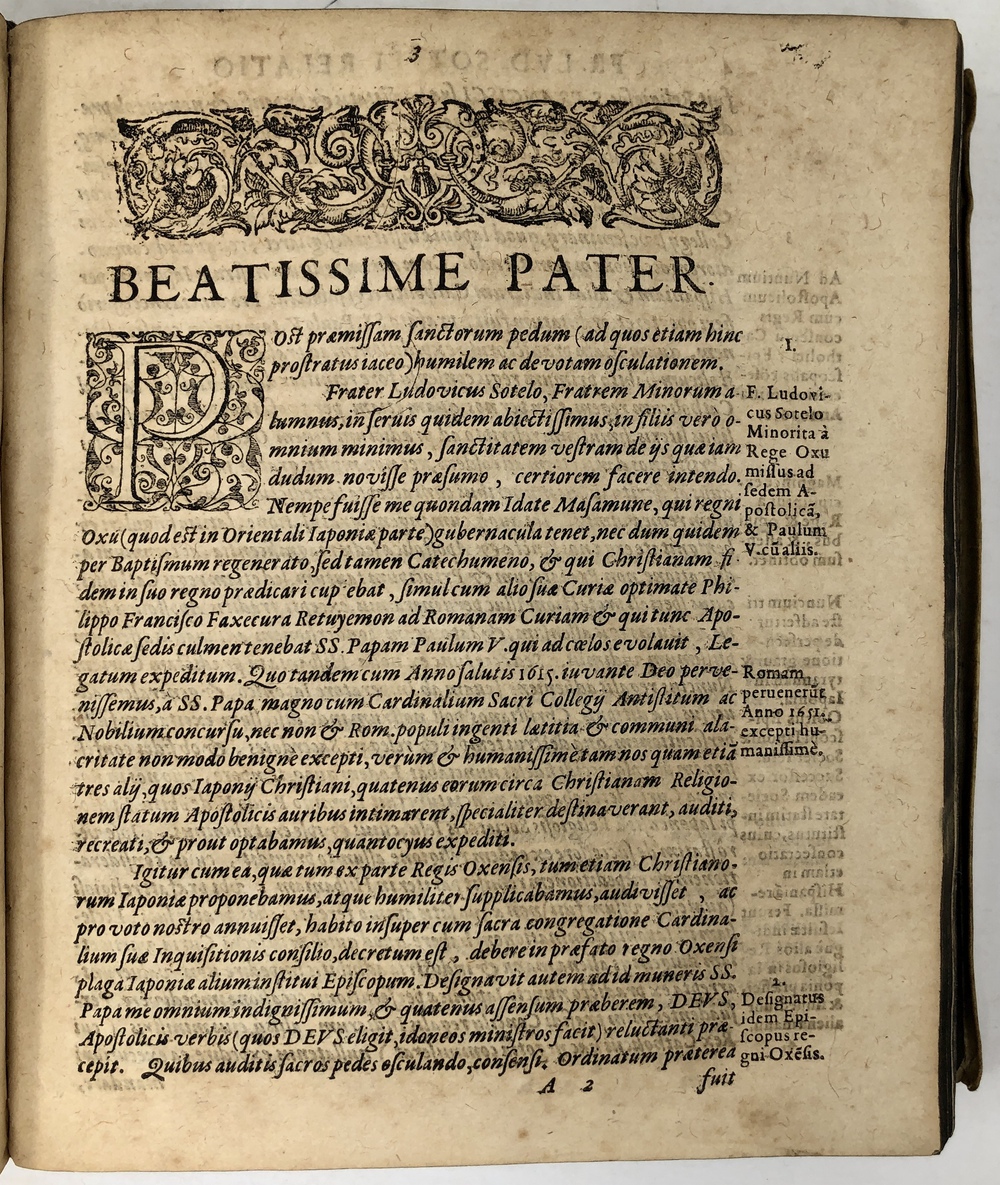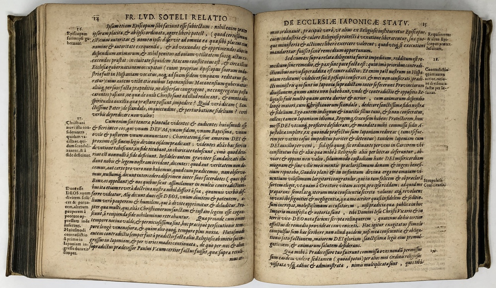 本書は、仙台藩主伊達政宗が1613(慶長18)年にヨーロッパに派遣した、いわゆる「慶長遣欧使節」の実現と遂行に最も深く関与したフランシスコ会士ソテロ(Luis Sotelo, 1574 - 1624)によって、再入国後に捕らえられた大村の牢獄から処刑直前の1624年1月20日付で、教皇に宛てて出された書簡の第2版です。本書初版は、『日本文典』(Ars grammaticae Iaponica linguae. 1632)や『懺悔録』(Niffon no Cotõbani Yô Confession. 1632)の著者としても著名なドミニコ会士コリャード(Diego de Collado, 1589? - 1641)によって1628年にマドリッドで刊行されていますが、第2版である本書は、フェルディナンド2世の顧問官でもあった著作家ショッぺ(Caspar Schoppe, 1576 - 1649)によって1634年に刊行されています。ショッぺによる注釈と、初版になかった付録「イエズス会における修道生活の規律の刷新の原因と方法の手引き」が新たに追加されていることが特徴で、これらは三十年戦争が混迷を深める中で、初版とは異なる文脈で第2版が刊行されていることを物語っています。また、本書はこのソテロ書簡だけでなく、主に三十年戦争と、それに関連したカソリックとプロテスタント間、ないしはカソリック各修道会間での争いについて扱った同時代の他の7作品が合冊されており、ソテロ書簡と慶長遣欧使節の評価をめぐる論争が、ヨーロッパを未曾有の混乱に陥れた三十年戦争における複雑な聖俗の利害対立とも密接に関わっていたことを示す大変興味深い書物となっています。