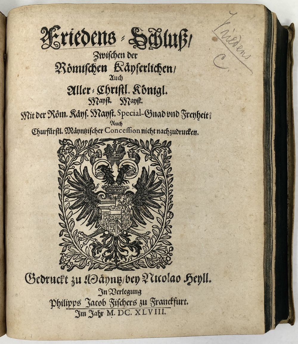 Friedens=Schluß zwischen der Römischen Käyserlichen / Auch Aller=Christl. Könige. Mayst. Mayst. Mit der Römischen. Käys. Mayst. Special-Gnad und Freyheit; Auch Churfúrstl. Mäyntzischer Concession nicht nachzudrucken.