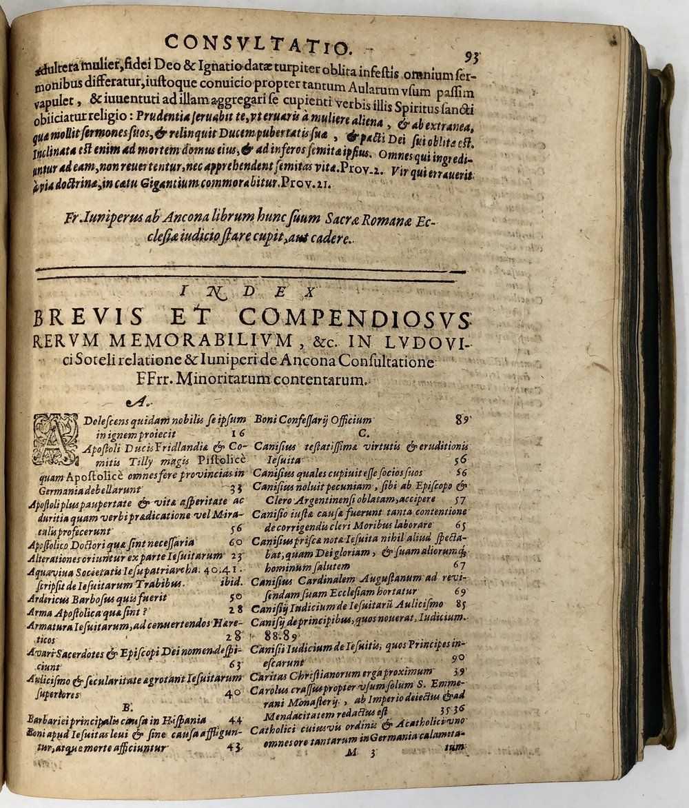 こうした自身の注釈に加えて、本書後半には初版になかった付録が新たに設けられていますが、これも注釈と同じくイエズス会を批判するために付け加えられたものです。前掲論文で、「この印刷物には、ソテロの報告とともに、ユニペルス・デ・アンコナ(ショッぺの偽名)の手になる『イエズス会の教育に関する所見(Consulatio)』が収録されている」(前掲論文89頁、脚注70より)と解説されているように、偽名を用いてショッぺがイエズス会の規律をめぐる問題を批判的に論じた内容となっています。