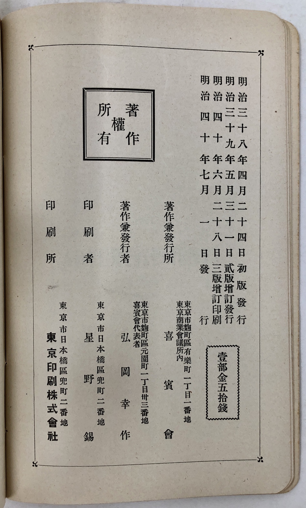 1907 (明治三十八年四月二十四日 初版発行、三十九年五月三十一日 貳版増訂発行、四十年六月二十八日 三版増訂印刷、七月一日発行).