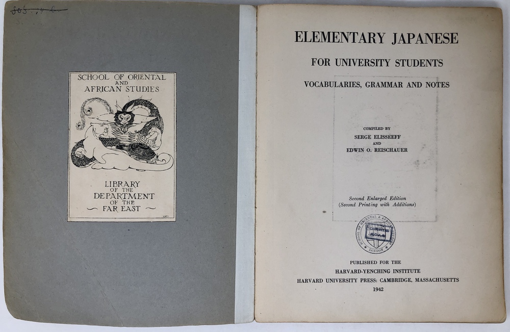 ロンドン大学東洋アフリカ研究学院(SOAS, School of Oriental and African Studies)の旧蔵書で、蔵書票が見返し部分に貼られているほか、タイトルページにも蔵書印と除籍印があり。