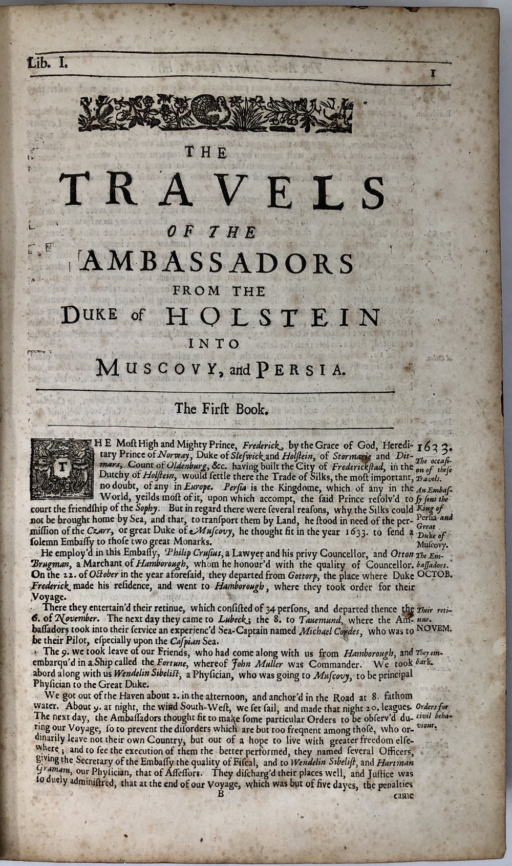THE Voyages and Travells OF THE AMBASSADORS Sent by FREDERICK DUKE of HOLSTEIN, to the Great Duke of Muscovy, and the King of Persia...whereto are added The TRAVELS of JOHN ALBERT de MANDELSLO,...in to the East-Indies...