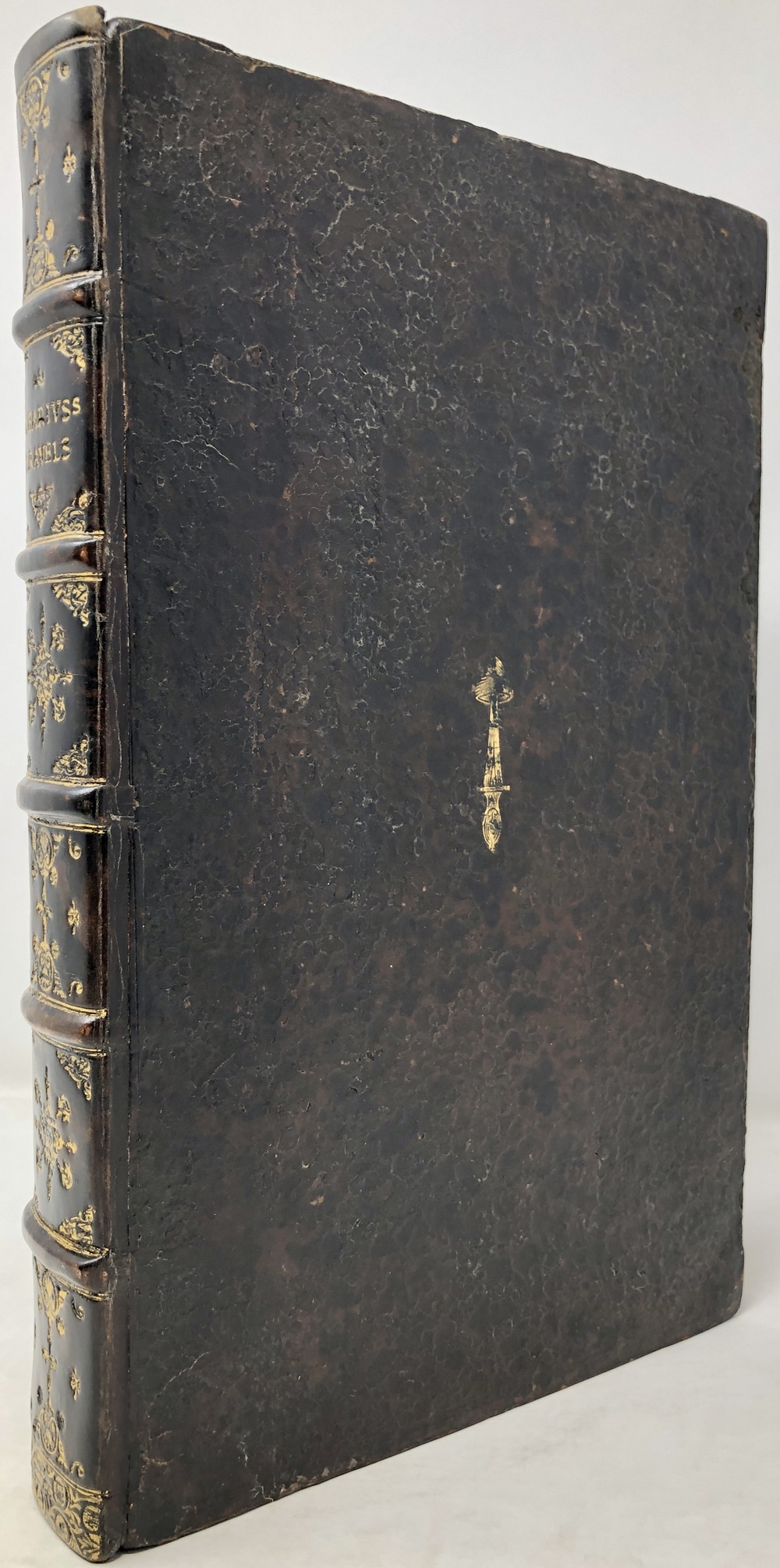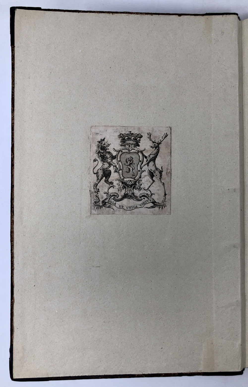 刊行当時の装丁を残しながら比較的近年に補修と改装が施されている。18世紀のものと思われる旧蔵者の蔵書票を残して見返しに貼付。