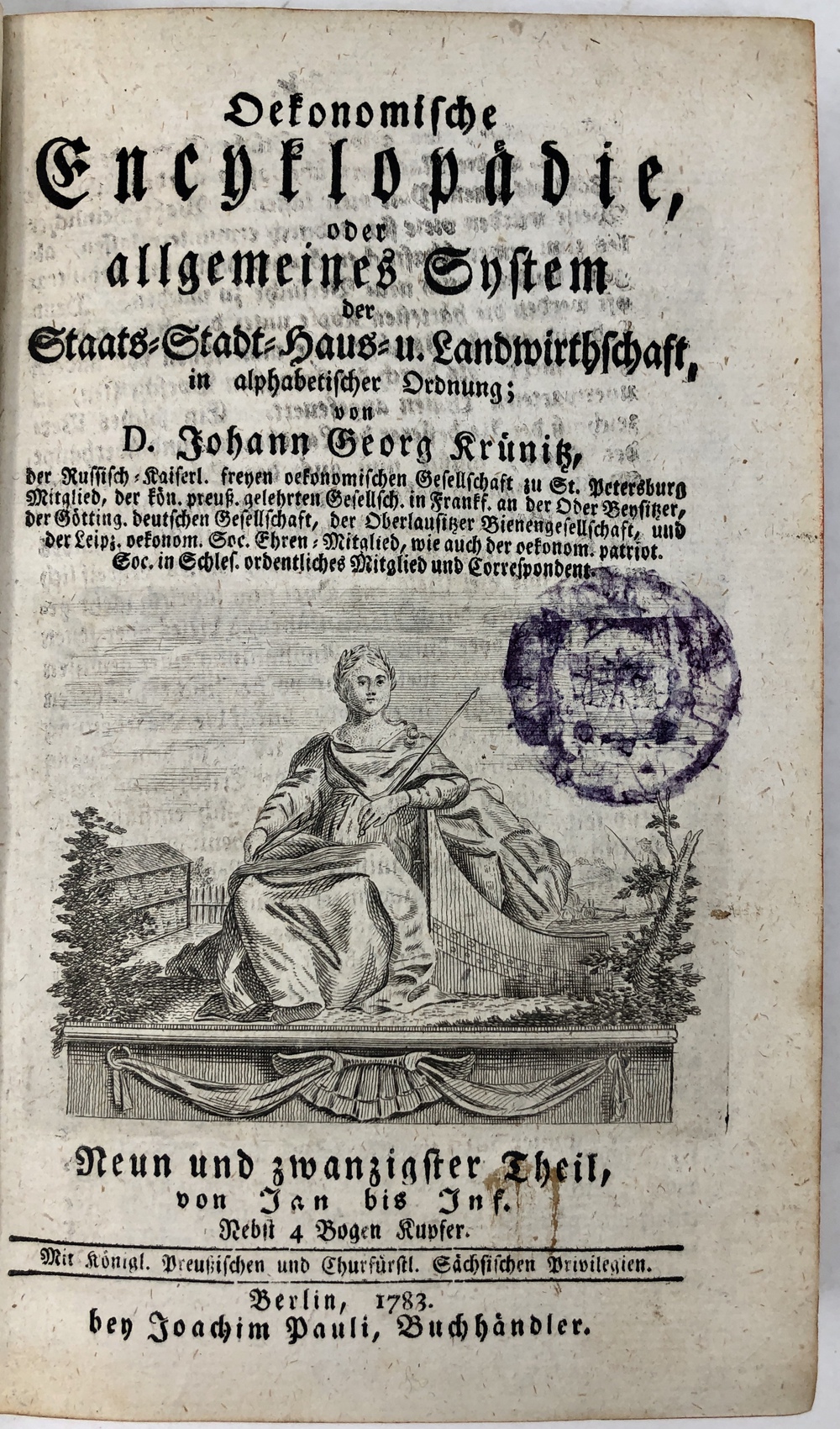 Oekonomische Encyklopädie, oder allgemeines System der Staats-Stadt=haus= u. Landwirtschaft, in alphabetischer Ordnung;…Neun und zwanzigster Theil, von Jan bis Jef.