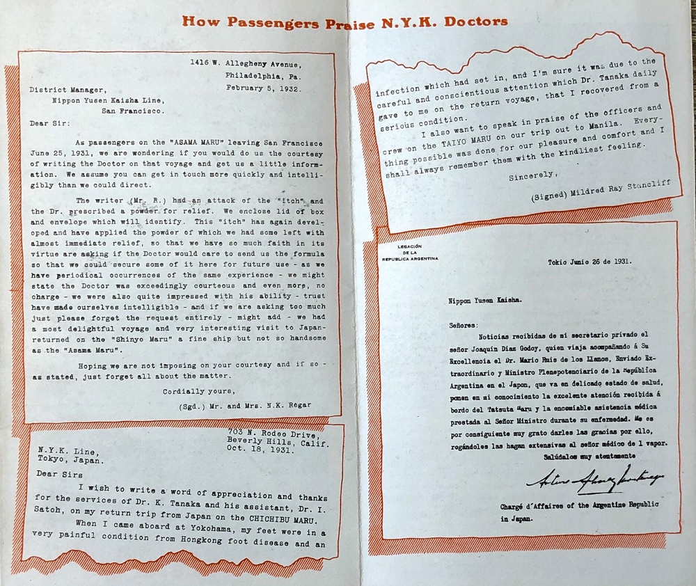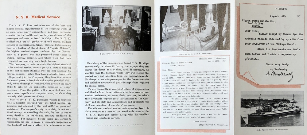 このパンフレットは、日本郵船が運行する汽船船内における医療設備がいかに充実したものであるかを紹介するためのものです。船内には博士号を保持する医師を含む複数の医師がいることや、乗客は、必要に応じていつでも充実した医療サービスを受けることができることが記されています。また、実際に医療サービスの提供を受けた乗客の声を、お礼の手紙を収録する形で紹介しています。