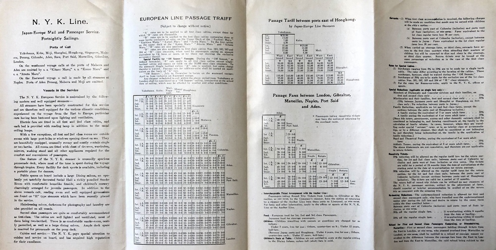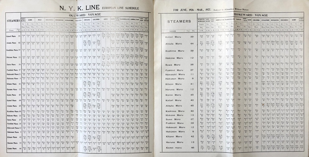1926年6月から1927年3月までの日本郵船による日本発欧州線のスケジュールと船舶を案内するパンフレットで、終点アントーワープまでの寄港各地への到着、出発予定の一覧表が掲載されています。それ以外にも、料金表や、各種サービスの概要、日本郵船が提供するオプショナルサービス、欧州線以外の主要航路、日本郵船の世界各地のオフィス所在地なども掲載されています。