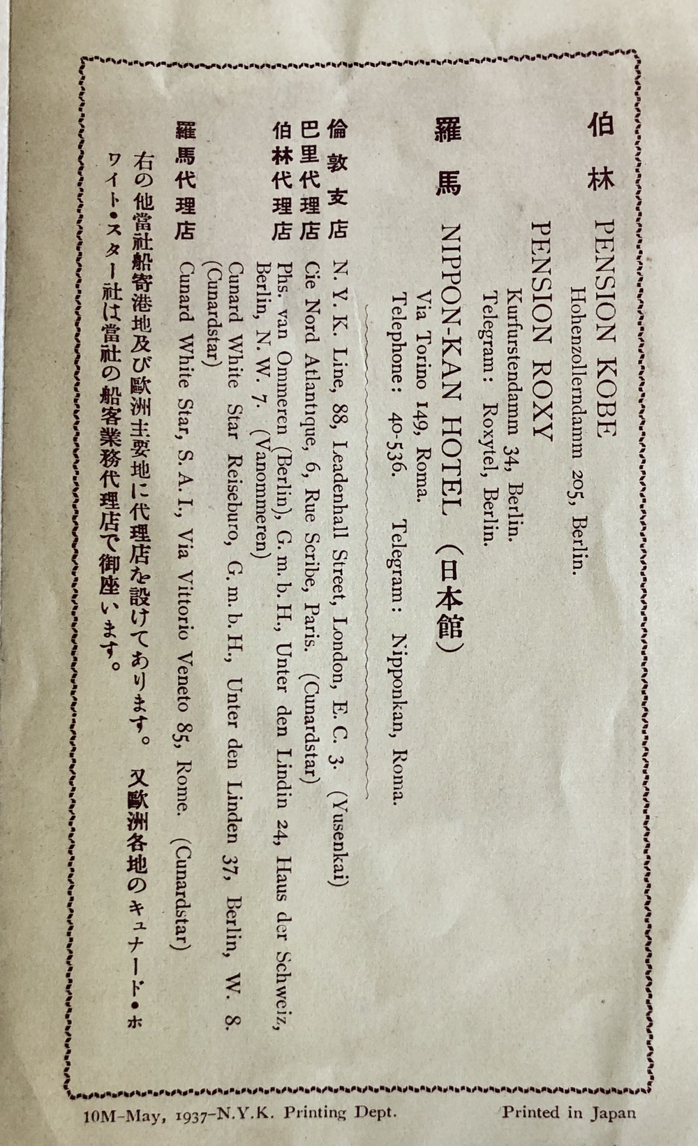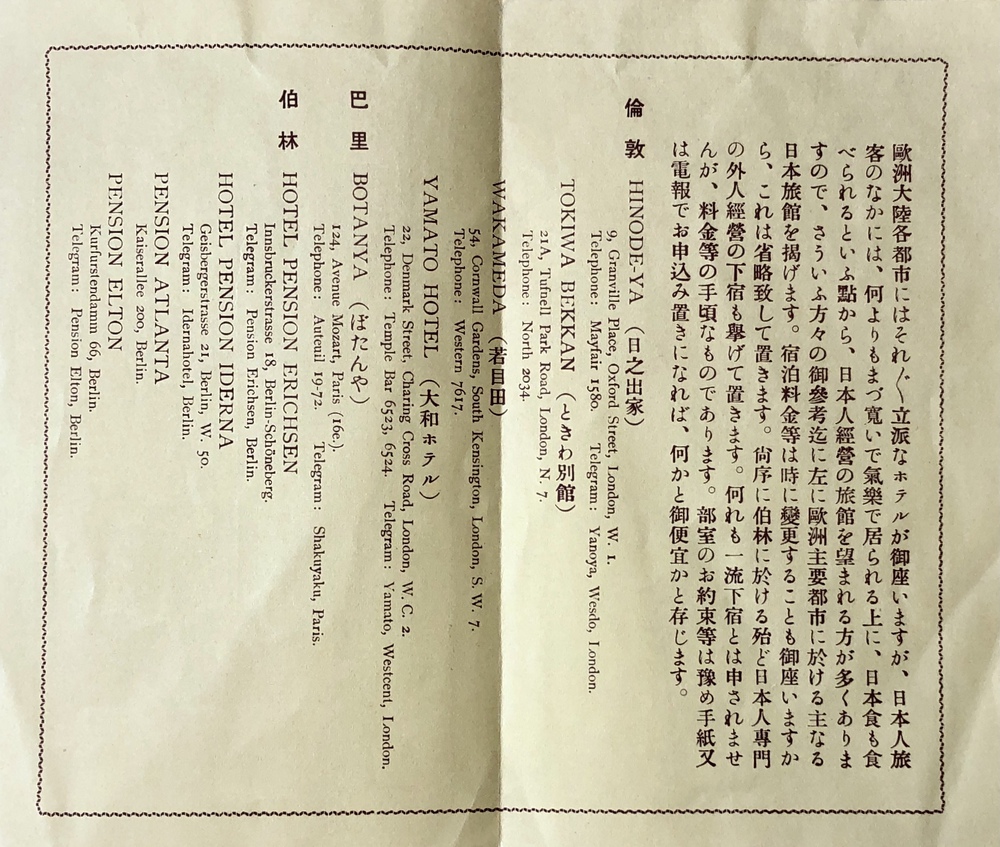 1枚単色刷の非常に簡単な印刷物ですが、ロンドン、パリ、ベルリン、ローマにおける「日本旅館」を案内している大変ユニークなものです。日之出家、ときわ別館、ぼたんや、日本館、といった名前からいかにも日本旅館風であることがわかる宿泊施設に加えて、ベルリンでは「殆ど日本人専門の外人経営の下宿」も掲載されており、Hotel Pension Erichsenなど、名称からはすぐに分からないような宿泊施設も紹介されています。