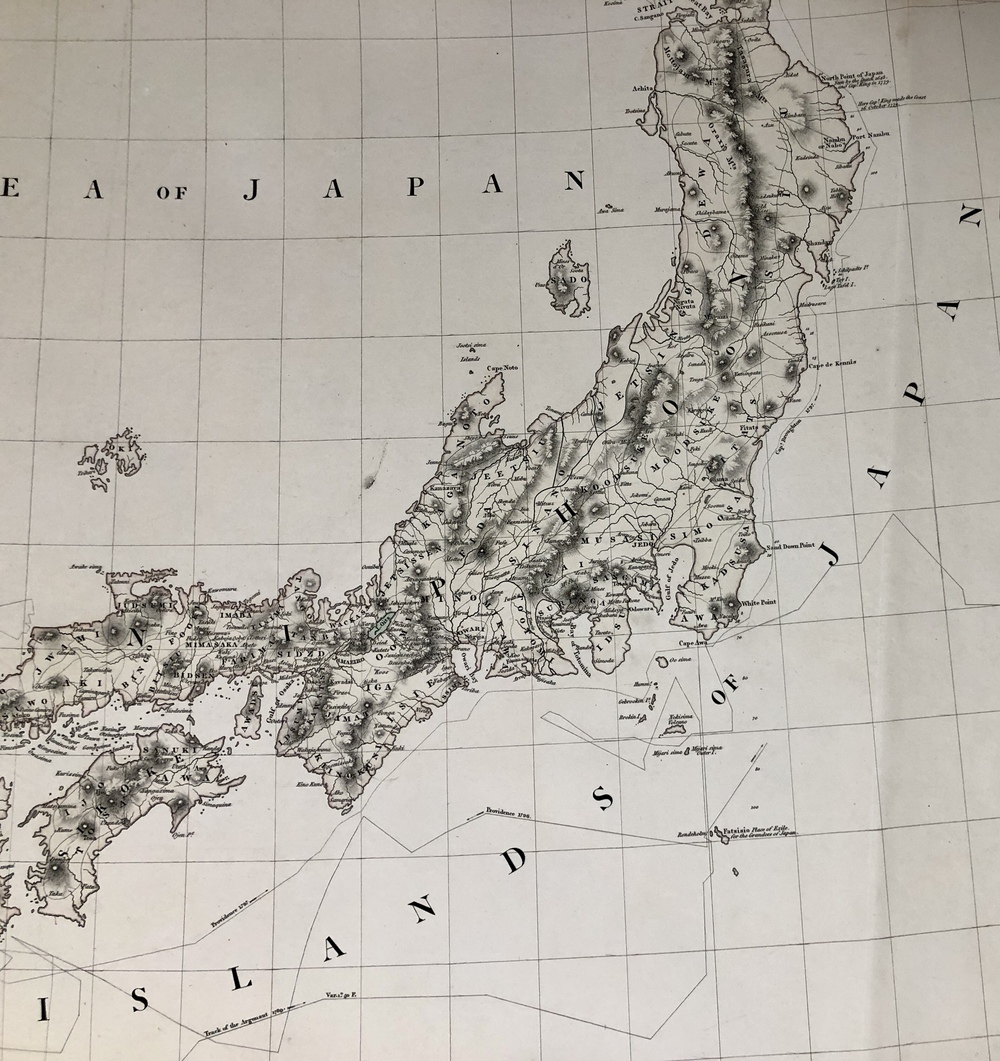 アロースミスは、より一般的な地図帳作成や、そこに収録されている日本図の製作者としても比較的よく知られていますが、巨大な2枚から本図は、そのような一般向けの地図とは明らかに異なる性格と目的を持った地図です。上述したようなイギリスの国家的利益にとっても重要視された地域を日本を中心にして描いた本図は、その大きさや印刷の精度、用いられている用紙の品質の高さに鑑みれば、当時の政財界の中枢にある人々への献呈のために特別に作成されたものと考えられます。地図帳に収録できるような通常のサイズではなく、極めて大型の地図として作成されたのは、壁掛けとして常時参照するという実用的な目的と、当時のヨーロッパ上流階層の室内には大型の地図が装飾用として掛けられることがよくありましたので、そうした美的観点も加味したものと考えられます。アロースミスは、王室付き地図製作者として、時代の要請に応えるべく、当時入手し得た最新の情報を組み合わせて本図を作成しており、コルネットの航海日誌だけでなく、ブロートン(William Robert Broughton, 1762 - 1821)、ラペルーズ(Jean François de Galaus, comte de La Pérouse, 1741 - 1788?)といった、18世紀末の日本近海をふくむ北太平洋地域への航海を果たし、豊富な航海情報を持ち帰った人物の記録を参照しています。また、アロースミスは、こうしたヨーロッパ人による最新情報だけでなく、当時日本で広く流布していた長久保赤水の「改正日本輿地路程全図」をも参照していたようで、「東北地方や佐渡の海岸の形などは『改正日本輿地路程全図』に類似」(小林茂ほか編『鎖国時代 海を渡った日本図』大阪大学出版会、2019年、61頁)しています。このように、東西の最新情報を駆使して作成された本図は、その圧倒的な大きさだけでなく、その正確さ、詳細さの点においても、極めて高い水準を有する地図となりました。