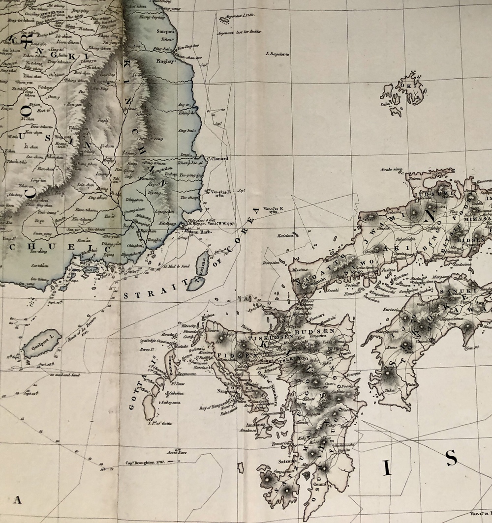 「イギリスのアロースミスはコルネットの報告書、地図を用いて、1811年刊日本図(1816年追補版もある)【1818年の誤りか?、1816年版の存在を店主は確認できず:引用者注】Map of Japan, Kurile, &c. With the Adjacent coast of the Chinese Dominions………(銅板、それぞれ1795 x 684ミリのもの2枚より成る、著者蔵)の中にコルネット探検の結果を描入し、それぞれI. Dagelet, Argonaut I. と記す2島を描き、なおコルネットの航路線を図している。ちなみにアロースミス(1750 7/14-1823 4/23)は当時の著名な地図、地理可で1770年頃より地図の彫版に従い、王室附地図家であり、またイギリス王立地理学教会創立者の一人でもあった。本日本図は従前の日欧作諸図を総合し日本読みの国々名、都会名、欧人命名の岬、島名等を記しラペルーズ、コルネット、ブロートン、クルーゼンステルン【クルーゼンシュテルンの成果が反映されるのは1818年改訂版からで、本図1811年版にはまだ反映されていない:引用者注】の航海路(追補版には1816年の英船Alcest号のそれをも)を入れ、なかんづくブロートンの航路を詳記し其の通過日、観測した海深、磁針偏差も記載している。欧米製日本図中、シーボルト日本図以前としては最大再詳図であった。」