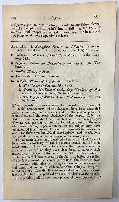 ART. III. - 1. Kaemper's Histoire de l'Empire du Japon....2. Golownin. Memoirs of Captivity in Japan....3. Nippon;...Dr. Von SIEBOLD. 4. Raffles' History of Java. 5. Charlevoix. Histoire du Japon. 6. Ashby's Collection of Voyages and Travels:...