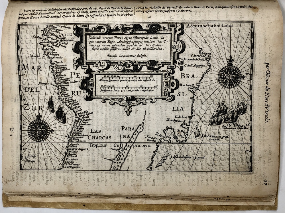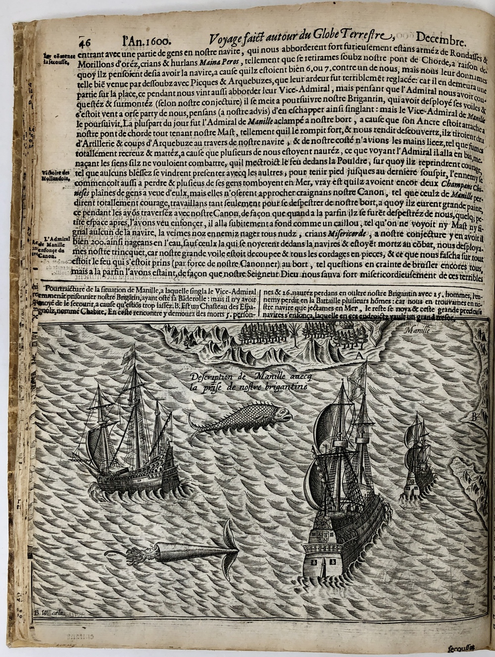 このように、『世界一周紀行』は、ファン・ノールト帰国直後からの大きな反響を受けて、短期間の間に、4度もの改訂を経て1602年に決定版が刊行されています。本書は、この1602年の決定版刊行とほぼ同時に、しかも同じ出版社から刊行されたフランス語訳初版で、その意味では、完成版初版とほぼ同じ位置付けを与えることができる、最も重要な版ということができます。アムステルダムの出版社であるCornelis Claeszは、航海記出版に秀でていた出版社で、リンスホーテンの『東方旅行記』の出版でも名高く、高品質な図版や地図の作成といった優れた制作技術を有していただけでなく、印刷した書物をヨーロッパ中に配本するという広大な販売ネットワークも有していました。また、同社は、本書と同時にドイツ語版(Eigentliche und warhafftige Beschreibung…Amsterdam, Cornelius Nicolaus, 1602)も手掛けていました。ファン・ノールトの『世界一周紀行』は、本書と同じ1602年にラテン語版も刊行されており、短期間の間に実に数多くの版が生み出されました。こうした書誌事項から、当時のヨーロッパにおいて、本書がいかに熱狂的に、また広く読まれたかを窺い知ることができます。