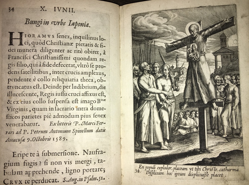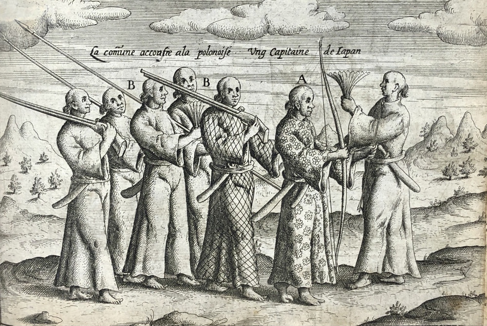 さらに、本書では、ファン・ノールトが出会った日本の船員の姿を描いた銅版画が収録されており、「これは《日本》に関する詳細な記述という点に特に興味深いものがあり、また日本の船や日本人を描いた銅版画は、ヨーロッパにおける最古の部類に入る」(ボイス・ペンローズ / 荒尾克己訳『大航海時代–旅と発見の二世紀』筑摩書房、1985年、387頁より)と言われるように、日本の人々の姿を描いた西洋の刊行物としては非常に重要なものです。ヨーロッパの書物において日本の人々の姿が図版として登場するのは、天正遣欧使節がヨーロッパを訪ねた際に刊行されたごくわずかな書物に収録されていた図版が、最初期のものと思われますが、イエズス会の報告書は基本的に図版や地図を伴わないものでしたので、こうした使節以外の、市井の日本の人々の姿を写実的に描いた図版としては、本書に収録された図版が最初のものではないかと思われます。この図では、ローブのような着物を纏い、腰に大小の刀を差し、弓や鉄砲、槍といった武器、そして扇子を手にした人々の姿が非常に写実的に描かれています。この図版は、当時のヨーロッパに強烈な印象を与えたものと思われ、後年の著作において日本の人々を描いた銅版画にも本図の大きな影響を見て取ることができます。しかも、その影響はオランダをはじめとしたプロテスタント諸国で刊行された書物にとどまらず、イエズス会による書物にも大きな影響を与えています。例えば、1608年にイエズス会によって刊行され、1597年の「二十六聖人殉教事件」を描いた最初の銅版画を含む、殉教銅版画集『磔刑のキリストの勝利』(Ricci, Bartolomoro. Triumphs Iesu Christ Crucifixi. Antwerp, 1608)において、描かれている日本の役人の姿は、明らかに本図に描かれた日本の船員の姿を範にとったものと考えられます。日本情報をヨーロッパに伝える上では、イエズス会による宣教報告が絶大な影響力と大きな役割を果たしていましたが、こと図版等による視覚情報の伝達という点においては、オランダ人ファン・ノールトが初めて出会った日本の船員を描いたこの図が、当時最大の影響力を持ったということができるでしょう。