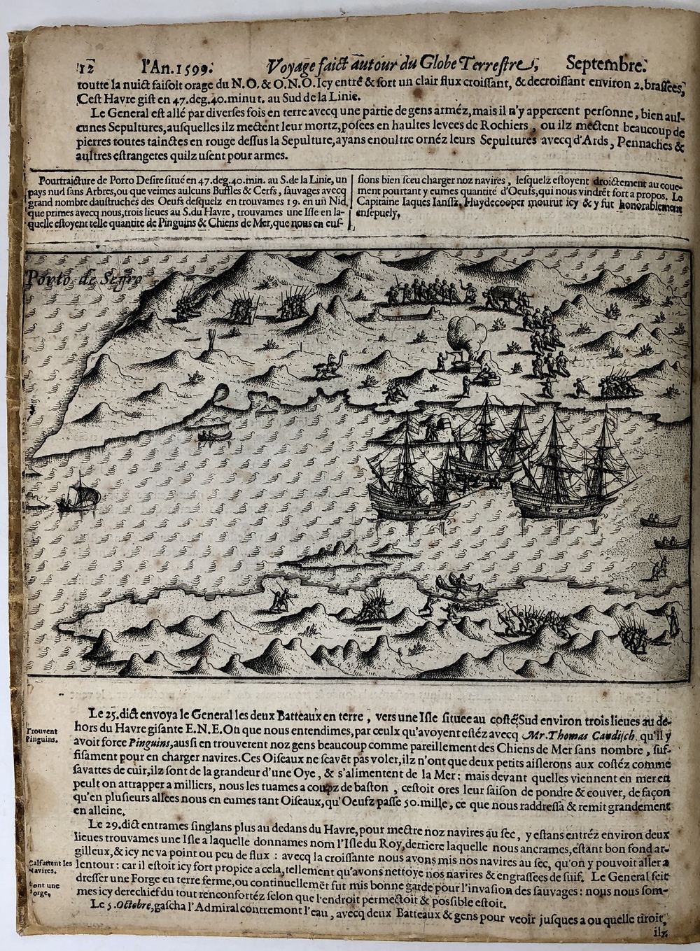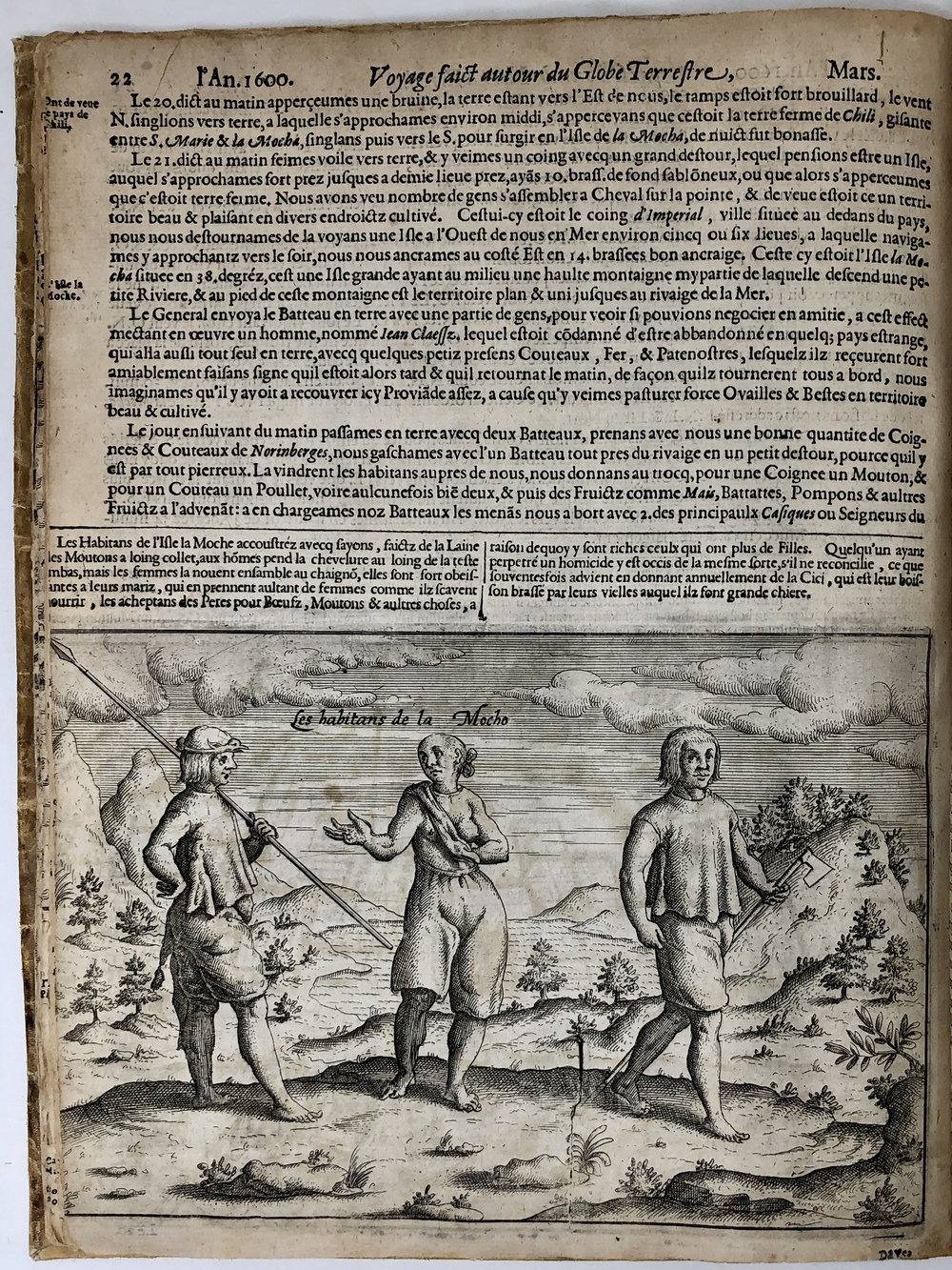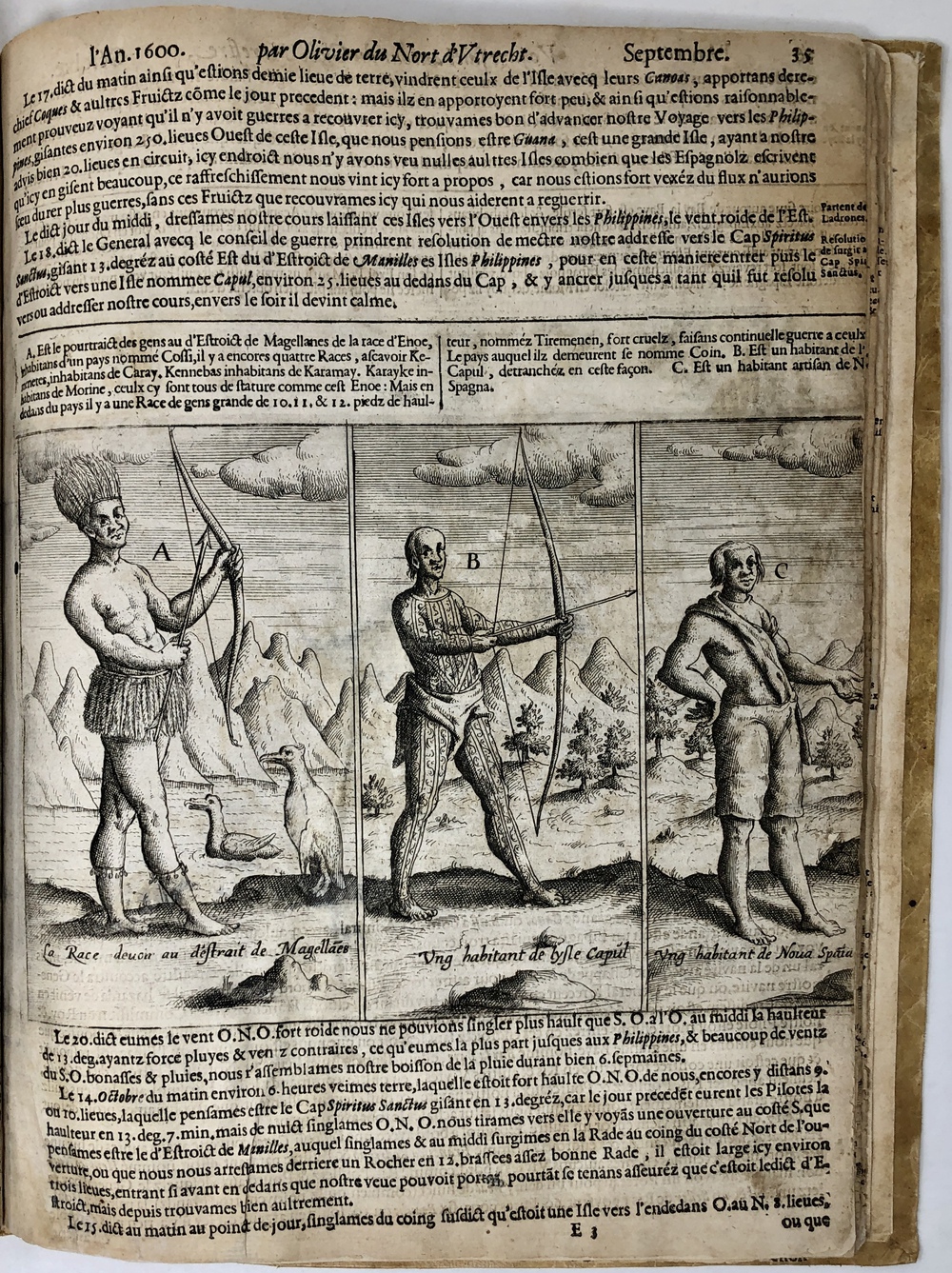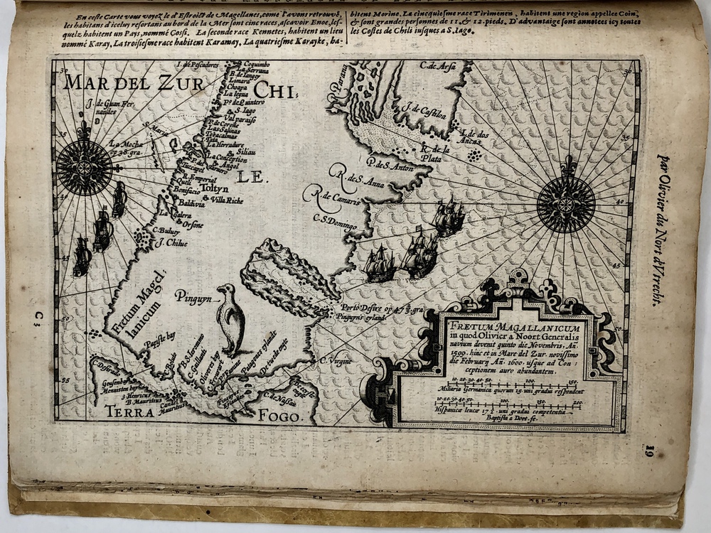 本書であるフランス語訳版は、当時のヨーロッパにおける言語的優位性に鑑みると、おそらくオランダ語版よりも広く読まれ、印刷部数も多かったのではないかと思われます。その人気を裏付けるように、細かな訂正を施した改訂版が1610年に刊行されています。しかしながら、これだけ多くの版が出されるということは、逆の面から見ると、販売された多くの書物が速報的な読み物として、読み捨てられていったということも意味しており、大判とは言えわずか60ページほどの書物である『世界一周紀行』は、現存しているものが非常に少ないことでも知られています。後年の旅行記集成(コメリン(Isaac Commelin, 1598 - 1676)による『東インド会社の起源と発展(Begin ende Voortgangh van de Verenigde Nederlantsche Geoctroyeerde Oost-Indische Compagnie. 1645 / 1646』など)に再録されるようになったこともあって、ファン・ノールト帰還当時の熱狂的な雰囲気を伝える最初期の1602年までの各版は、いずれの版であっても極めて稀覯とされているのが現状です。おそらく最もよく読まれ、数多く印刷されたであろうと思われるフランス語訳版でさえ、現存するものは非常に少なく、稀に出現した場合でも後年1610年版であるか、あるいは本書の大きな魅力である図版や地図が欠落(転売目的で図版のみが切り取られたためと考えられる)していることが多いようです。