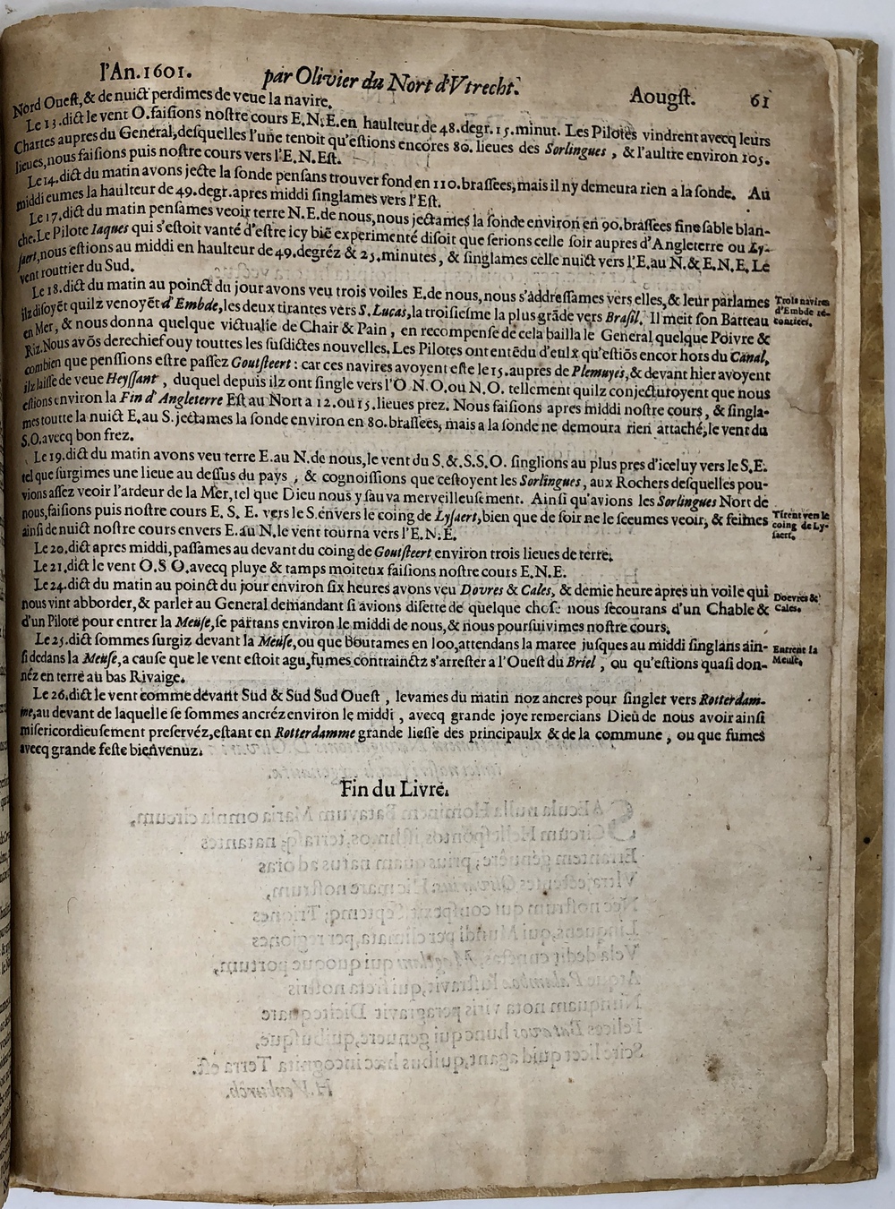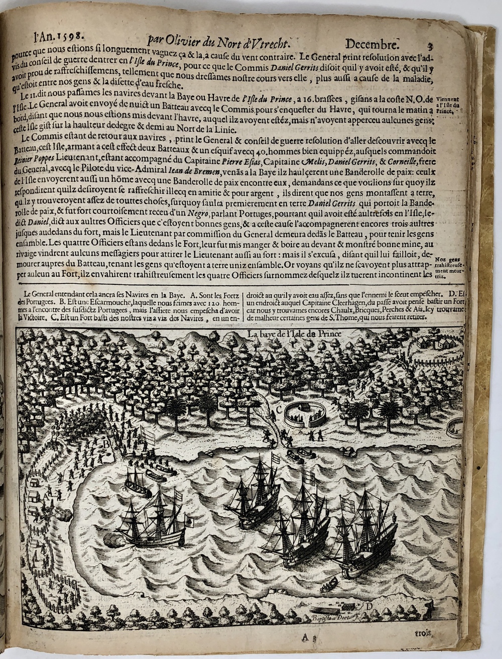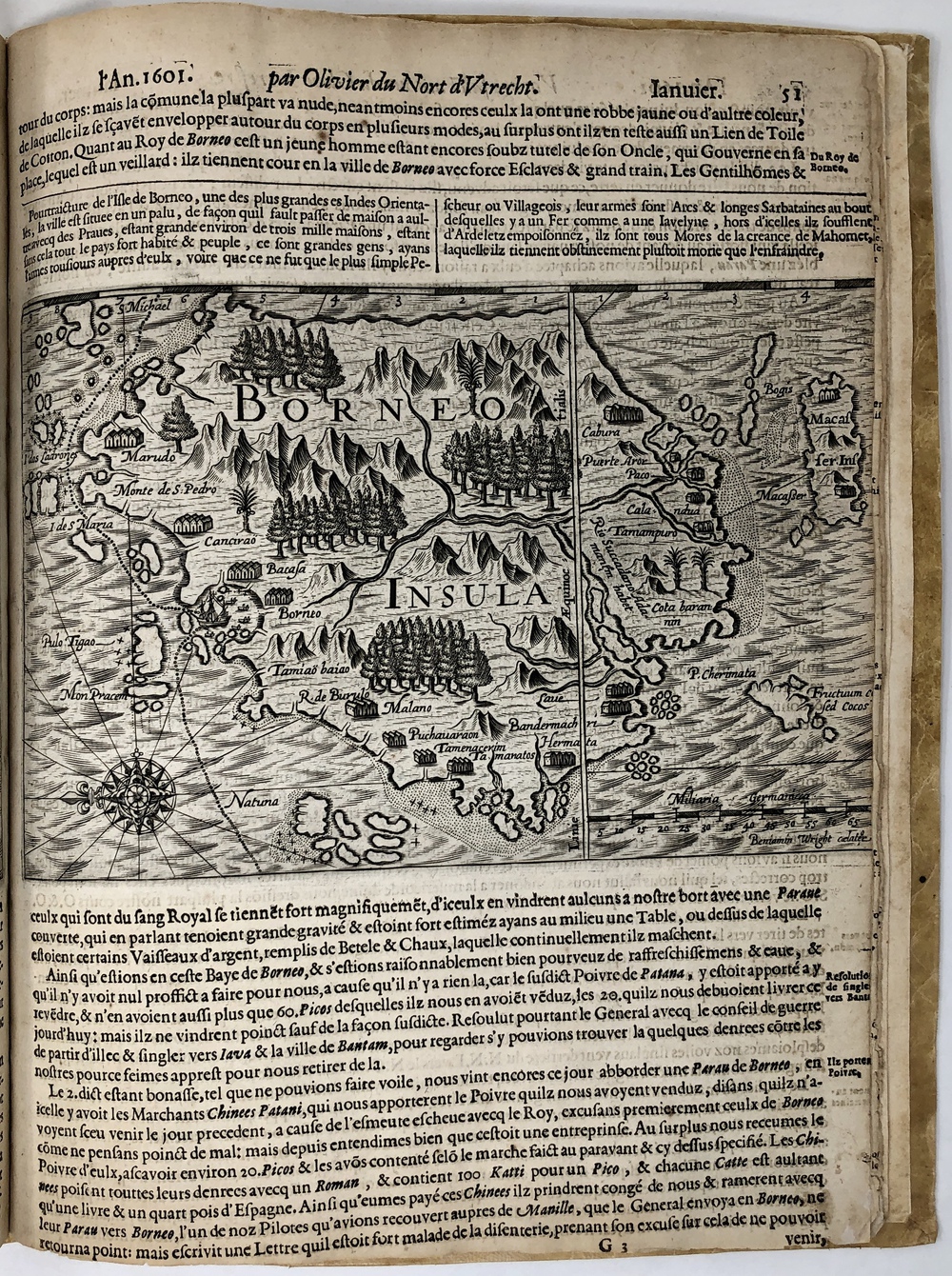 本書であるフランス語訳版は、当時のヨーロッパにおける言語的優位性に鑑みると、おそらくオランダ語版よりも広く読まれ、印刷部数も多かったのではないかと思われます。その人気を裏付けるように、細かな訂正を施した改訂版が1610年に刊行されています。しかしながら、これだけ多くの版が出されるということは、逆の面から見ると、販売された多くの書物が速報的な読み物として、読み捨てられていったということも意味しており、大判とは言えわずか60ページほどの書物である『世界一周紀行』は、現存しているものが非常に少ないことでも知られています。後年の旅行記集成(コメリン(Isaac Commelin, 1598 - 1676)による『東インド会社の起源と発展(Begin ende Voortgangh van de Verenigde Nederlantsche Geoctroyeerde Oost-Indische Compagnie. 1645 / 1646』など)に再録されるようになったこともあって、ファン・ノールト帰還当時の熱狂的な雰囲気を伝える最初期の1602年までの各版は、いずれの版であっても極めて稀覯とされているのが現状です。おそらく最もよく読まれ、数多く印刷されたであろうと思われるフランス語訳版でさえ、現存するものは非常に少なく、稀に出現した場合でも後年1610年版であるか、あるいは本書の大きな魅力である図版や地図が欠落(転売目的で図版のみが切り取られたためと考えられる)していることが多いようです。
