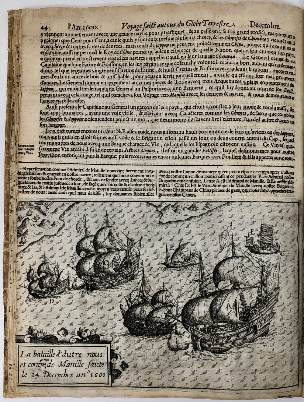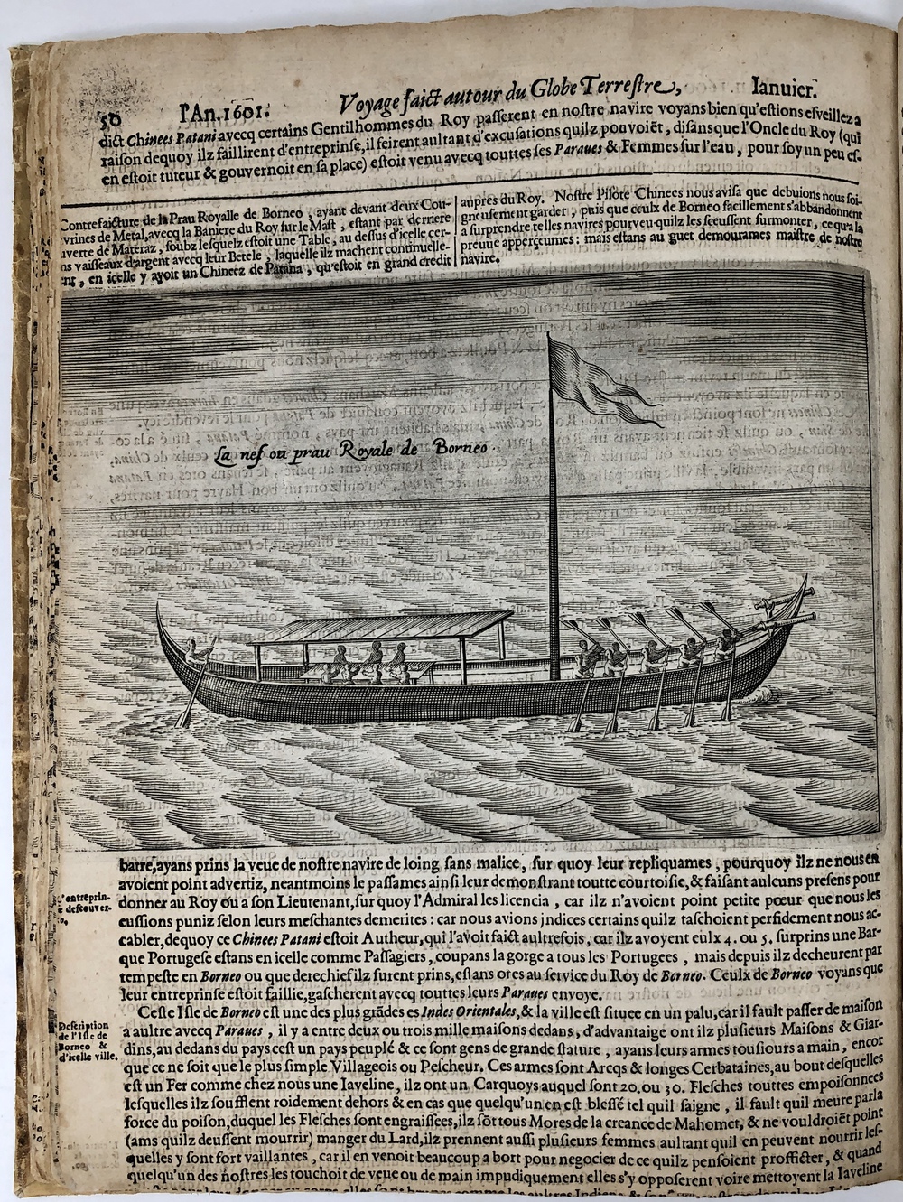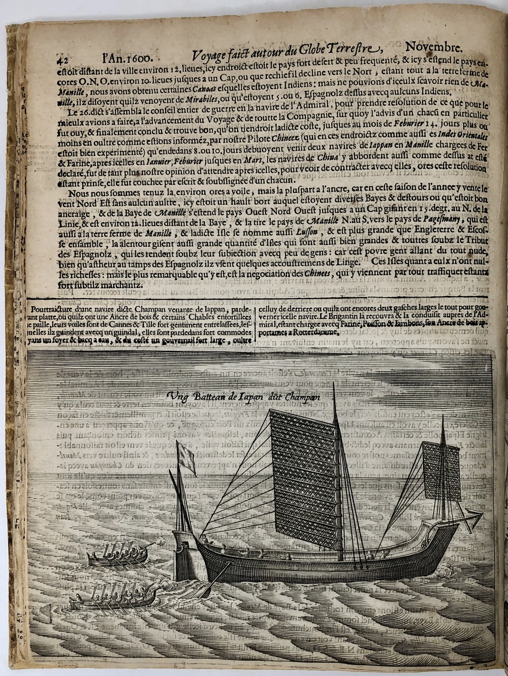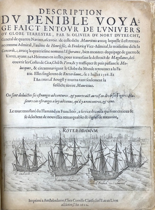 本書は、オランダ人航海士による初の世界就航を成し遂げたファン・ノールトの航海記で、帰国直後の1602年に刊行されたフランス語訳初版です。ファン・ノールトによる世界周航は、オランダが海洋諸国として世界進出する礎を築いただけでなく、オランダ人が日本の船員との直接交渉によって得た情報をもとに、同時代の日本におけるイエズス会らによる日本宣教と貿易の状況を、当事者以外の外部の視点から報じ、しかも彼らの風貌や船舶を紹介するという、日欧交渉史にとっても画期的な出来事となりました。本書は、この画期的なファン・ノールトによる世界周航を、帰国後一年足らずという極めて短期間で詳細に報じた書物として、日本関係欧文史料として第一級の価値を有する書物です。