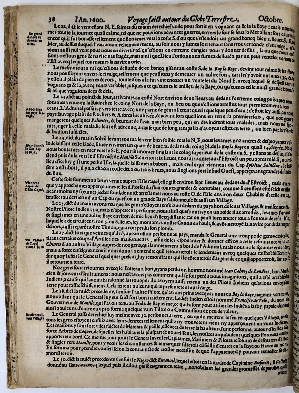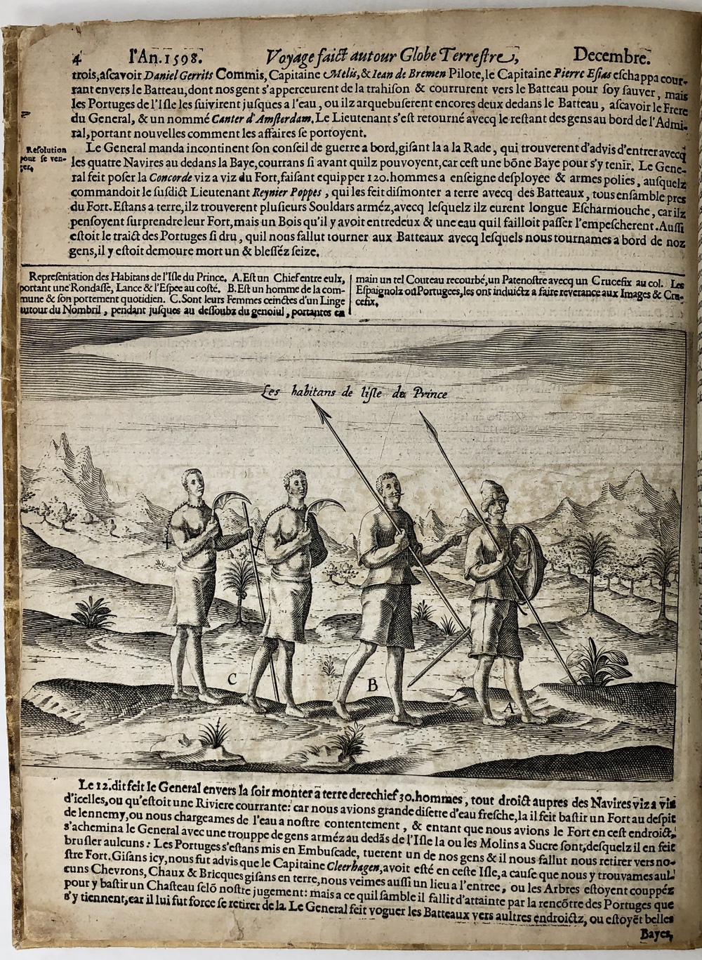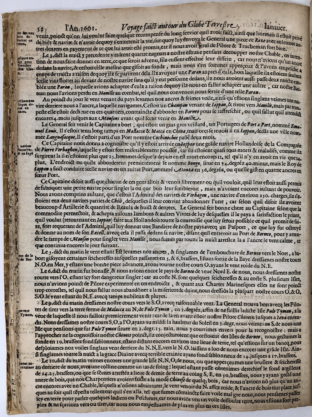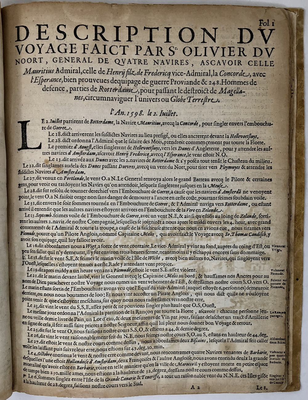 本書は、オランダ人航海士による初の世界就航を成し遂げたファン・ノールトの航海記で、帰国直後の1602年に刊行されたフランス語訳初版です。ファン・ノールトによる世界周航は、オランダが海洋諸国として世界進出する礎を築いただけでなく、オランダ人が日本の船員との直接交渉によって得た情報をもとに、同時代の日本におけるイエズス会らによる日本宣教と貿易の状況を、当事者以外の外部の視点から報じ、しかも彼らの風貌や船舶を紹介するという、日欧交渉史にとっても画期的な出来事となりました。本書は、この画期的なファン・ノールトによる世界周航を、帰国後一年足らずという極めて短期間で詳細に報じた書物として、日本関係欧文史料として第一級の価値を有する書物です。