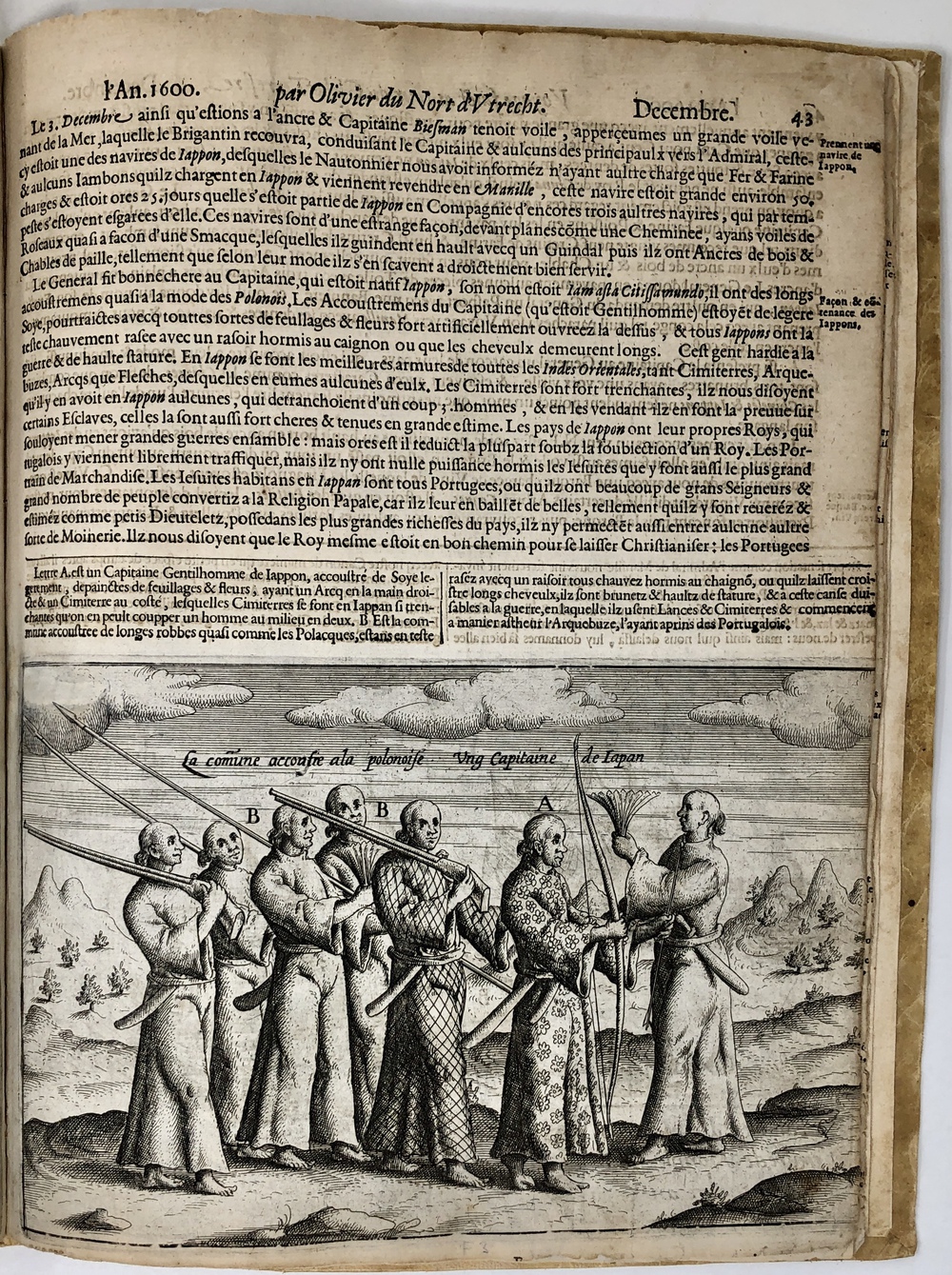 また、ファン・ノールトは、日欧交渉史においても非常に大きな足跡を残しています。ファン・ノールト自身は日本に直接赴くことはありませんでしたが、日本船と洋上で二度も遭遇しており、これは、オランダ人と日本の船員とが直接交渉した、記録される限りでの最初期の出会いとなりました。しかも、後述するようにファン・ノールトはこの時の出来事を詳細に記録しており、これが帰国後にすぐさま出版されることによって、オランダ人と日本との交渉を報じた最初の書物となりました。当時のヨーロッパにおける日本情報は、イエズス会を中心としたカトリック修道会による宣教報告が、事実上唯一のものでしたので、同時代の日本の情報をイエズス会以外の立場から論じ、しかもすぐさまそれが一般に公開されたという点において、ファン・ノールトと日本との出会いは、日欧交渉の新しいページを開く歴史的な出会いとなりました。