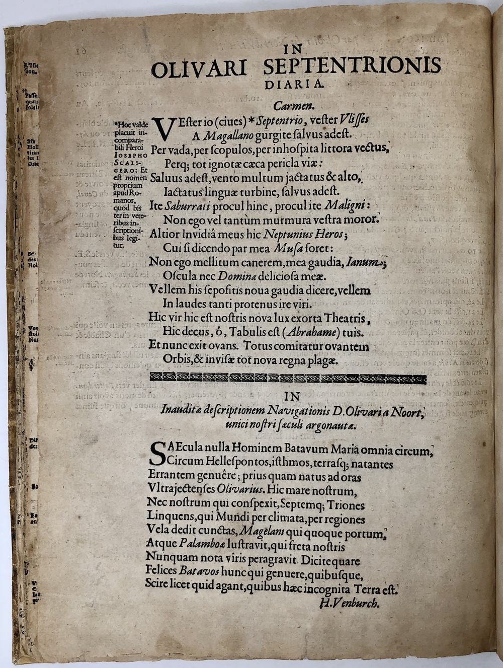 15世紀末に始まったいわゆる「大航海時代」は、ポルトガルとスペインという当時の二大カトリック国によって主導され、「新世界」の情報と富を独占してきました。オランダは、1578年以来、独立を求めてスペインと対立し、八十年戦争と呼ばれる長い戦争に入っていましたが、その過程で、それまでの商業と交易の中心都市であったアントワープがスペインによって劫掠されるなど、既存の地中海水域をはじめとした近隣海域での交易の続行が困難となり、「東インド」への進出に打開策を見出すようになります。この動きを強力に推進したのが、リンスホーテン(Jan Huygen van Linschoten, 1562? - 1611)による「東方旅行記」(Itinerario. Amsterdam, 1595)を含む『旅行記三部作』です。この書物は、それまでポルトガルとスペインのごく限られた人々しか知ることができなかった東インドに関する機密情報を惜しげも無く披露し、スペイン・ポルトガルの東インド各地への航路と拠点地の内情を図版と地図を合わせて紹介することで、オランダ人による同地への進出を強く促すことになりました。これにより、1590年代後半には、オランダの海洋進出の動きが本格化し始めることになり、スペインやポルトガルの船舶や拠点を略奪、攻撃しながら、その財宝を入手し、それらを元手に現地で交易を行うことで、莫大な富を本国に持ち帰るという計画が次々と打ち出されるようになります。こうした計画の一つとして遂行され、海洋進出黎明期のオランダにとって、画期的な成果を上げることになったのが、まさしくファン・ノールトによる世界周航でした。