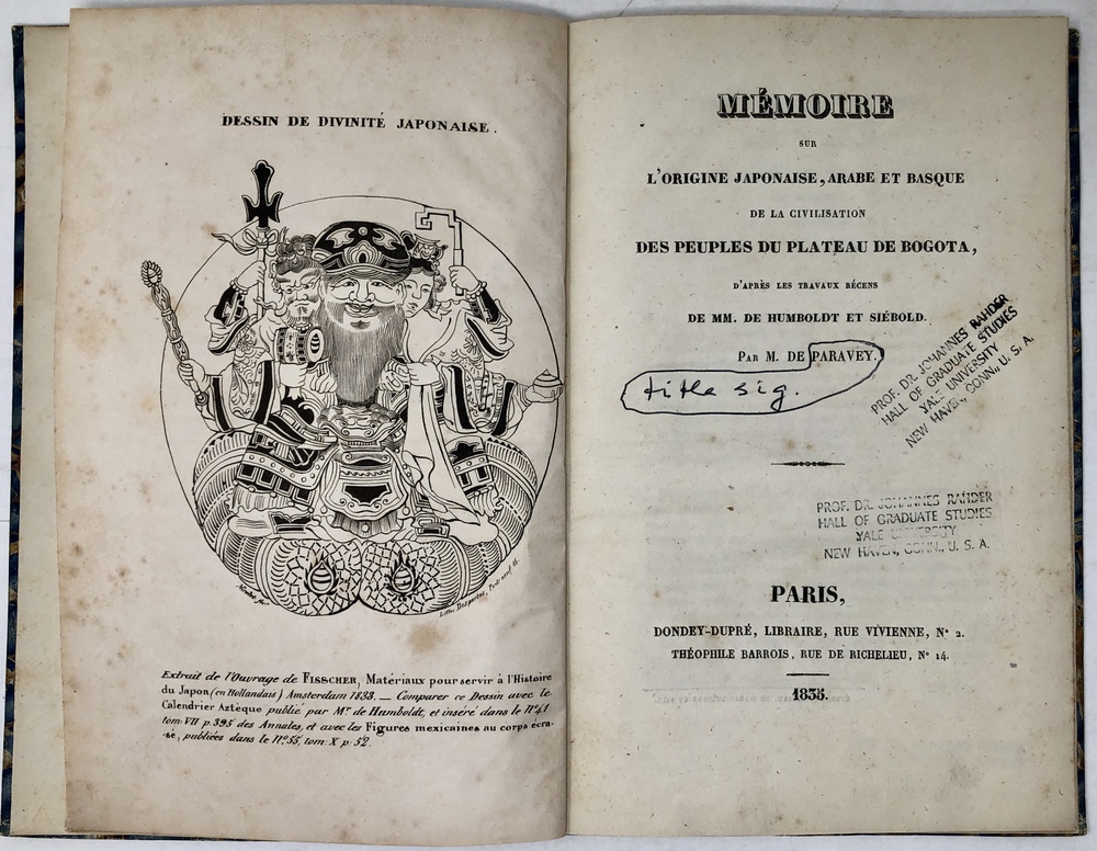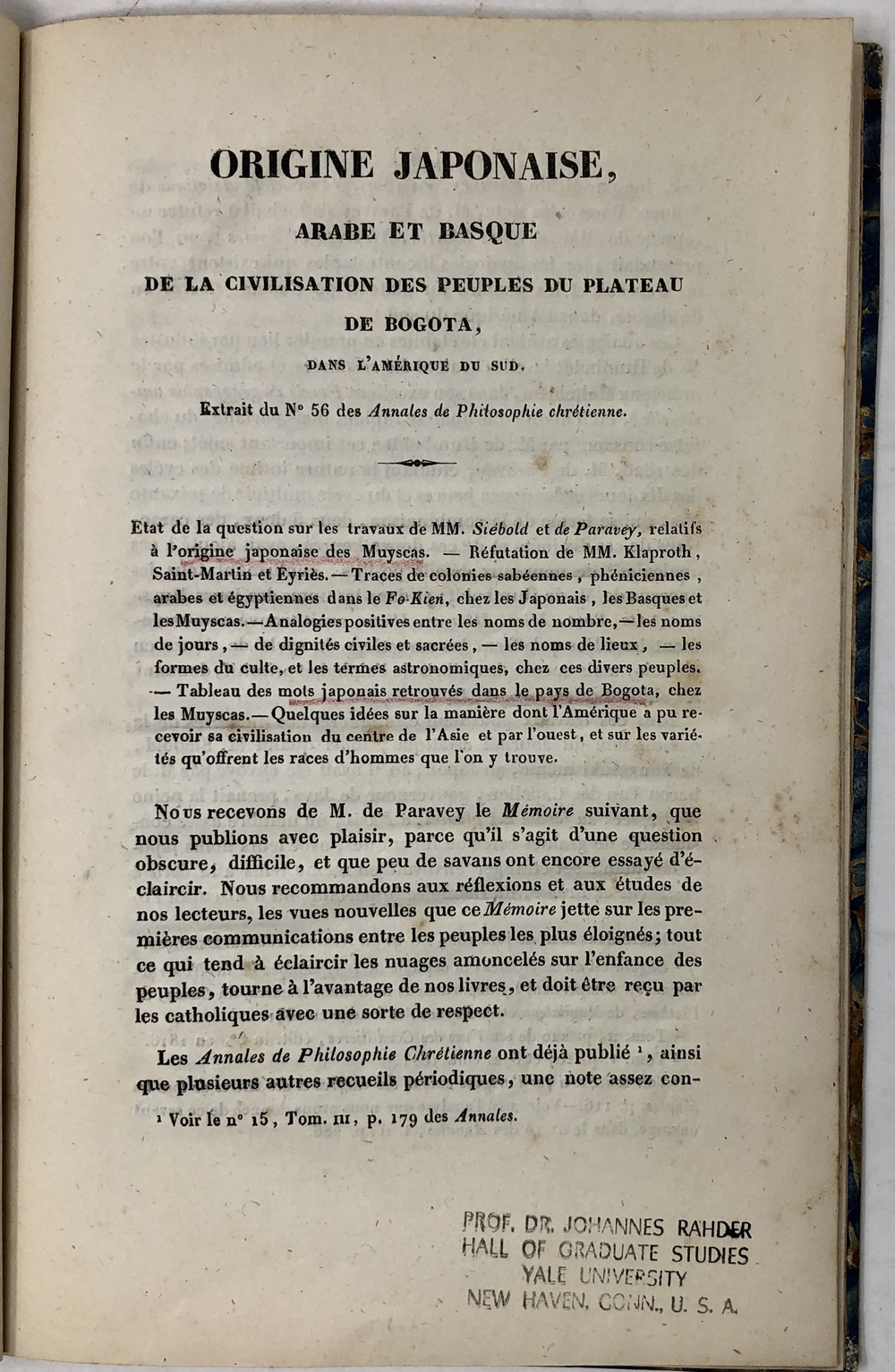MÉMOIRE SUR L'ORIGINE JAPONAISE, ARABE ET BASXUE DE LA CIVILISATION DES PEUPLES DU PLATEAU DE BOGOTA, D'APRÉS LES TRAVAUX RÉCENS DE MM. DE HUMBOLDT ET SIÉBOLD. PAR M. DE PARAVEY.