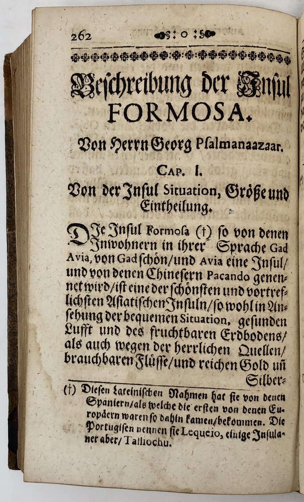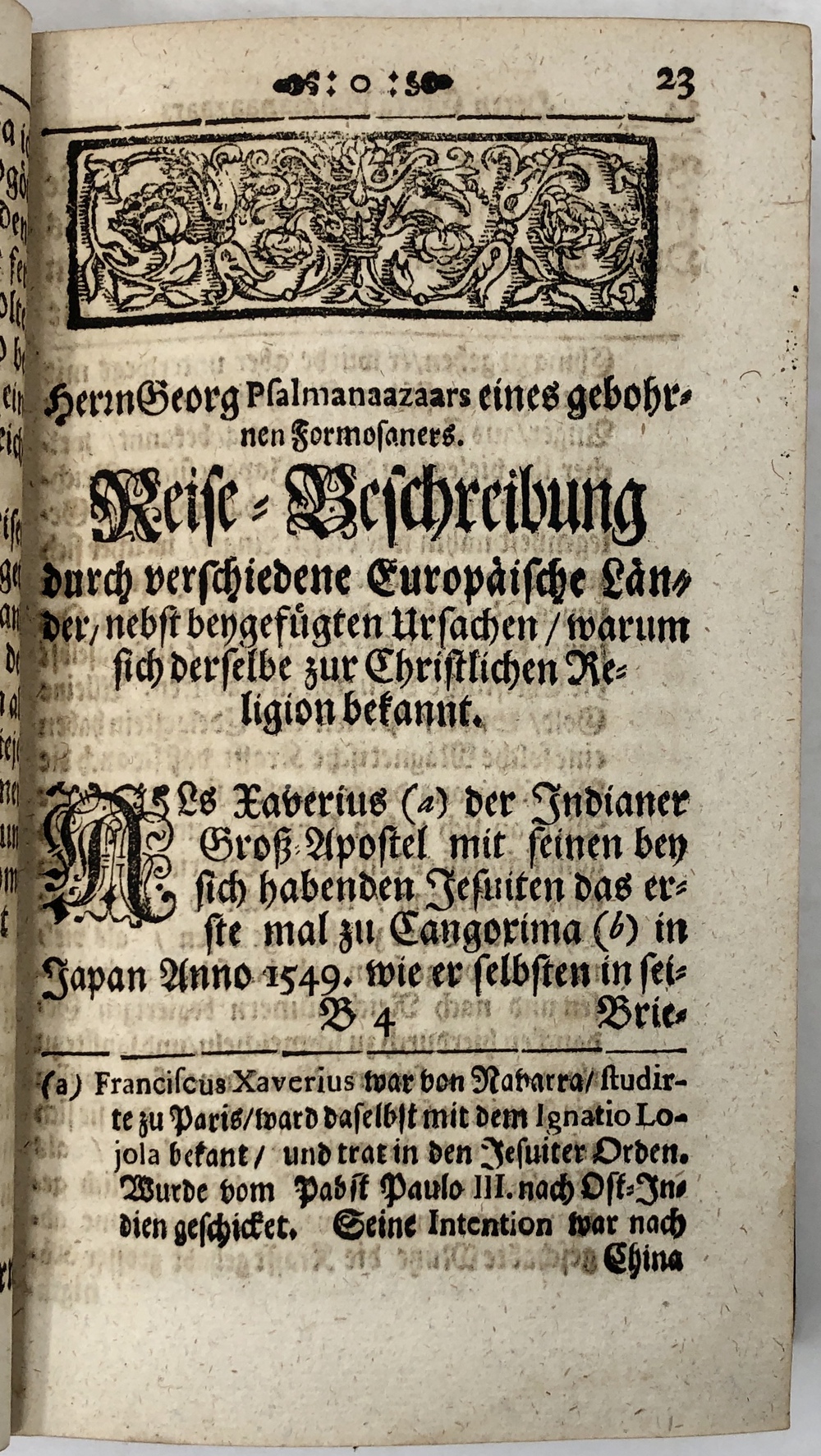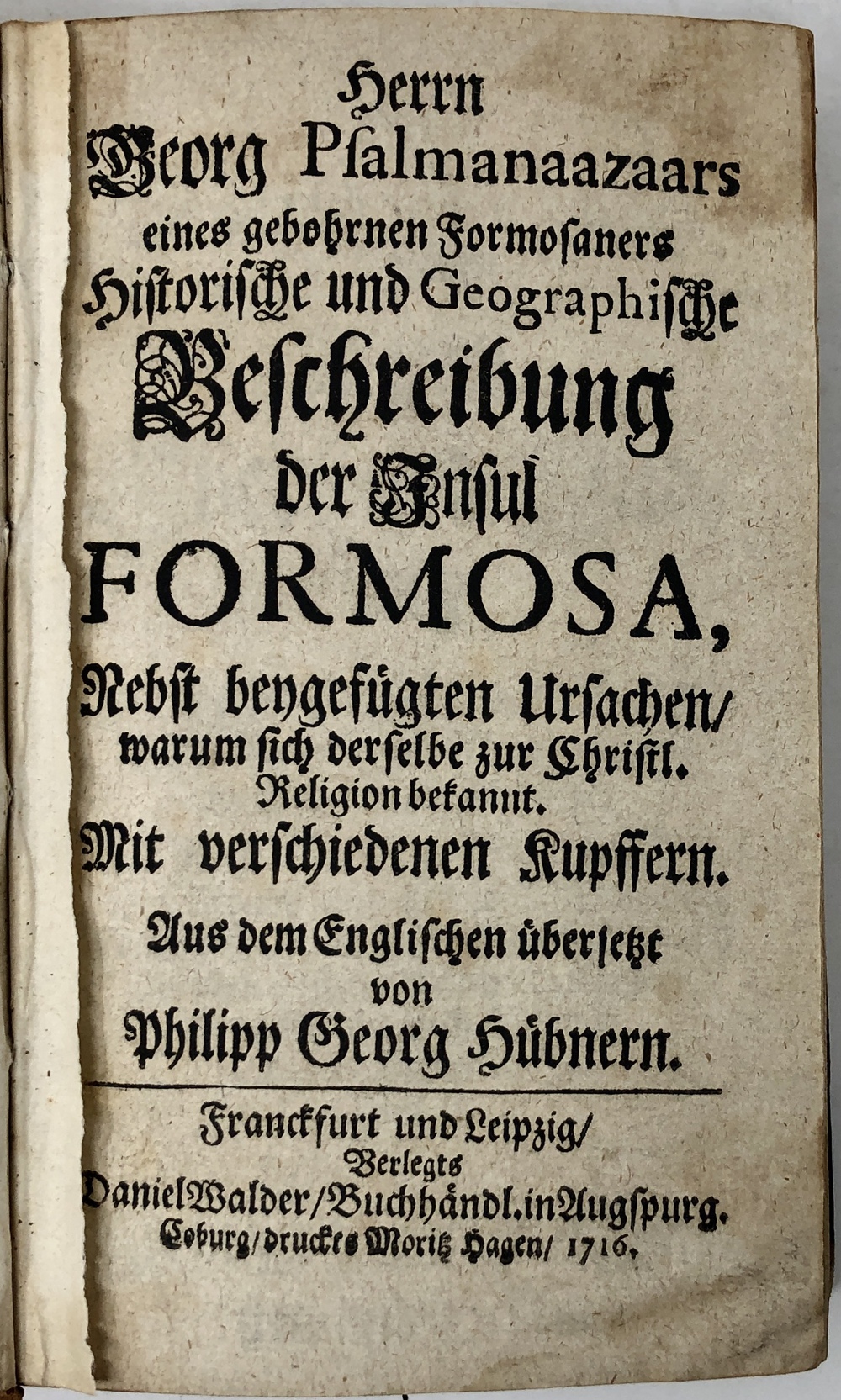 Herrn Georg Psalmanaazaar eines gebohren Formosaners historische und geographische Beschreibung der Insul FORMOSA, nebst beygefügten Ursachen/ warum sich derselbe zur Christi. Religion bekannt. Mit Verschiedenen Kupffern. Aus dem Englischen übersetzt von