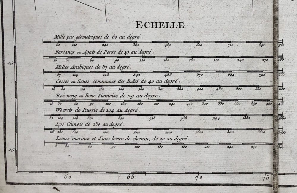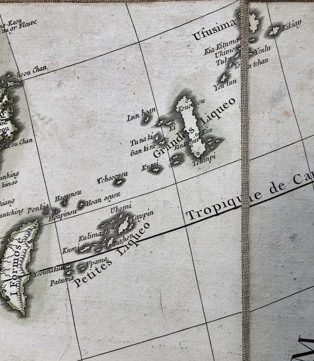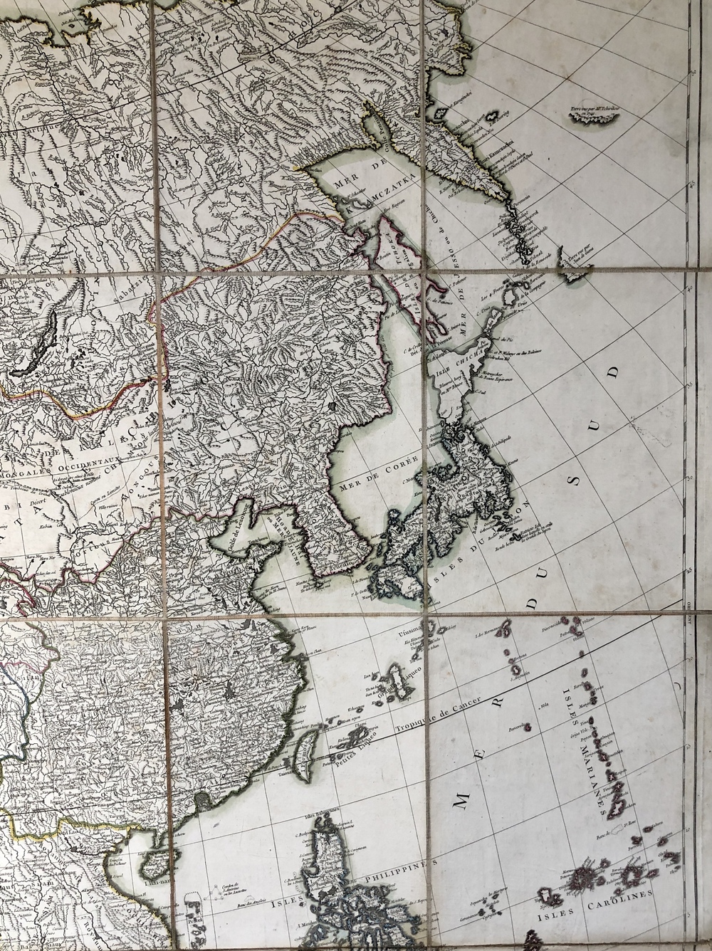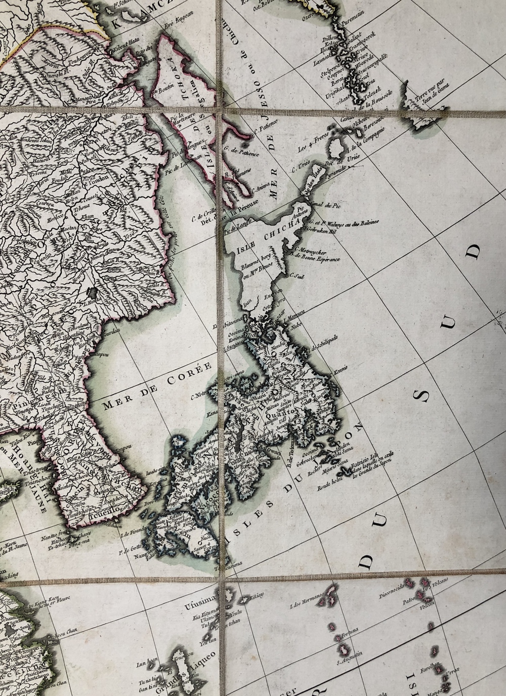 本図を作成したヴォーゴンディ(Gilles Robert de Vaugondy, 1686 - 1766)は、当時のフランスにおける地図制作者として最も信頼されていた人物で、フランス王付きの地理学者として数多くの地図を制作し、出版していました。本図は、ヴォーゴンディが日本を含むアジア全域を描いた、短辺が1メートルを超える極めて大型の壁掛け図で、よく見られるような地図帳に収録するための地図の切り取り図ではなく、独立して出版されたものです。地図帳に収録する地図と異なり、一定の社会的地位にある人物に贈呈するために作成されたものと思われ、壁掛けにすることを前提にして、全面を24分割した上で、裏面をリネンによる裏打ちを施しています。この大型壁掛けアジア図は、大いに好評を博したようで、店主の確認できる限りでは、1778年に続いて、刊行年を明記していない改訂版が18世紀中に出されており、本図は後者の改訂版に基づいて1821年に再版されたものです。従って、ヴォーゴンディによるこの大型壁掛けアジア図は約半世紀にわたってフランス語圏で権威ある図として認められていたことになります。 ヴォーゴンディは、自身の地図帳に収めるために単独の日本図も幾度も作成していますが、本図における日本の姿は、こうした日本図を採用しつつ、周辺地域との関係を考慮したものとなっています。本州、四国、九州の主要な輪郭については、べラン(Jaques Nicolas Bellin, 1703 - 1772)がシャルルヴォア(Pierre François Savier de Charlevoix, 1682 - 1761)の『日本誌』(Histoire et description generale du Japon. 2 vols. Paris, 1736)のために1735年に作成したケンペル型の日本図(Carte de l’empire du Japon…)を採用し、本州北端と北海道南端については、ダンヴィユの韃靼・中国図(Carte generale de la Tartarie Chinoise)を採用しています。 北海道の輪郭については、当時地理学者、地図制作者、航海者の間で様々な議論が行われており、樺太が半島であるのか、あるいは島であるのかや千島列島との繋がりも含めて、数多くの説が提出されていました。ヴォーゴンディは特にこの議論に関心を持っていたようで、自身が作成した日本図やアジア図ではこの地域の描き方については、最新の議論を反映させて細かに独自のアップデートを行なっています。ヴォーゴンディは、1749年に発表した日本図(Le Japon)において、北海道を半島ではなく、はっきりと島として描きましたが、その北西部の輪郭はユーラシア大陸に寄り添うようにかなり巨大に描かれていました。これは、1643年にこの地域の航海と測量を行なったオランダ東インド会社のフリース(Maerten Gerritsz de Vries, 1589 - 1647)の測量に基づいて作成された図の影響を受けたもので、フリースの地図は、ヴォーゴンディに限らず17世紀、18世紀を通じて多くの地図製作者に大きな影響を与えていました。ヴォーゴンディは、1778年版のアジア図では、1749年に発表した自身の日本図に従って北海道を描いていましたが、改訂版である本図においては、この部分の輪郭を改め、樺太をより実際の輪郭に近いものにすると同時に、北海道の大きさをかなり縮小しているように見受けられます。 日本図、特に北海道の描き方において大きな後年の地図制作に影響を与えたヴォーゴンディは、日本においても比較的その名前がよく知られている人物ですが、本図のような大型壁掛けアジア図を作成していたということは、ほとんど知られていないのではないかと思われます。ヴォーゴンディによる大型壁掛けアジア図は、地図帳に収録された日本図やアジア図に比べて、その特別な目的のため、制作される点数が非常に少なかったものと思われ、国内研究機関はおろか、世界的に見てもその所蔵点数は極めて限られたものになっています。その意味においても、本図は非常に貴重で重要な地図ということができるでしょう。
