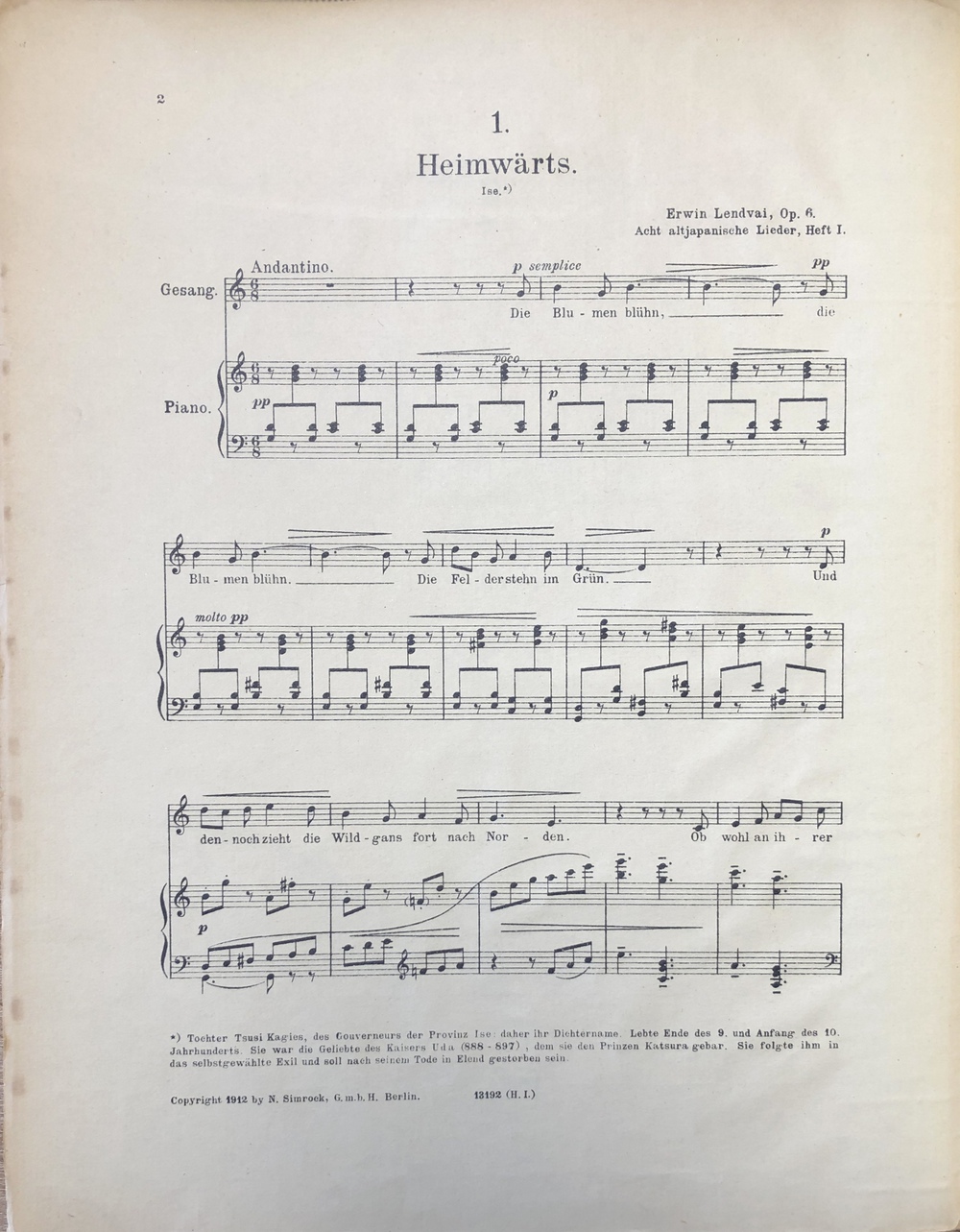 ACHT ALT-JAPANISCHE LIEDER FÜR MITTLERE STIMME MIT KLAVIERBEGLEITUNG. HEFT 1. (OP.6)