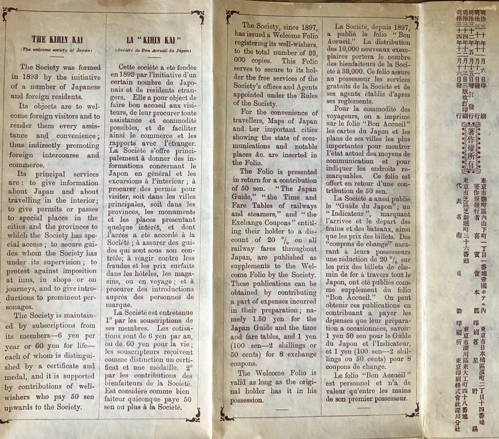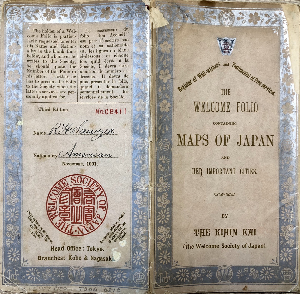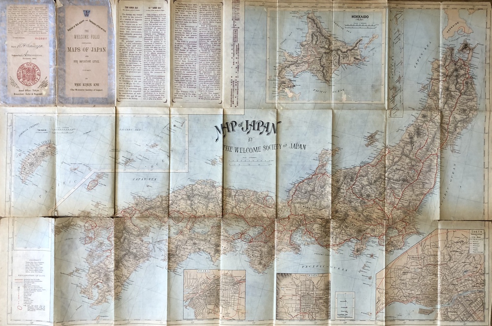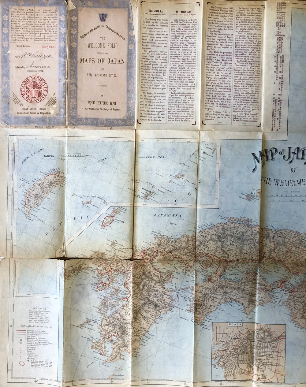 THE WELCOME FOLIO CONTAINING MAPS OF JAPAN AND HER IMPORTANT CITIES. Register of Well-wishers and Testimonial of Free services.