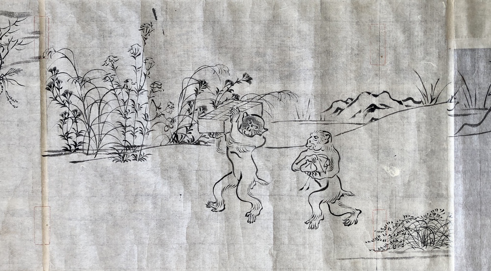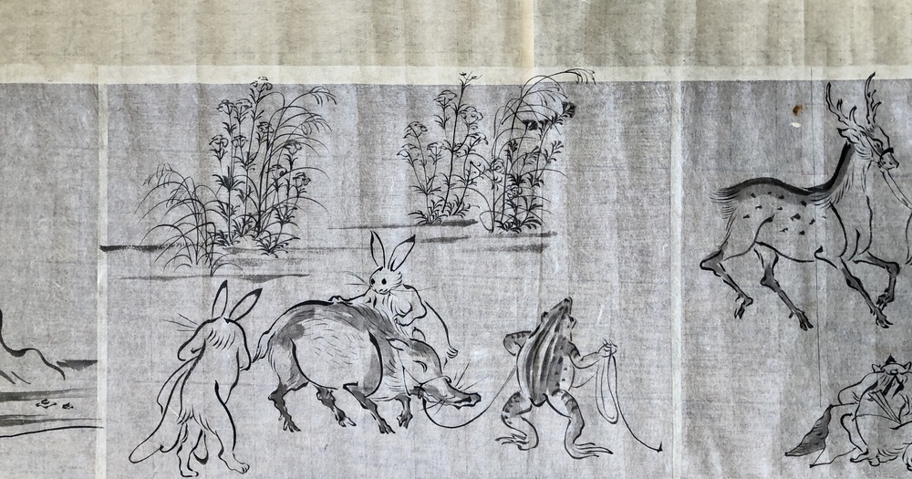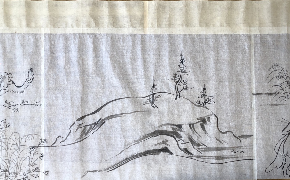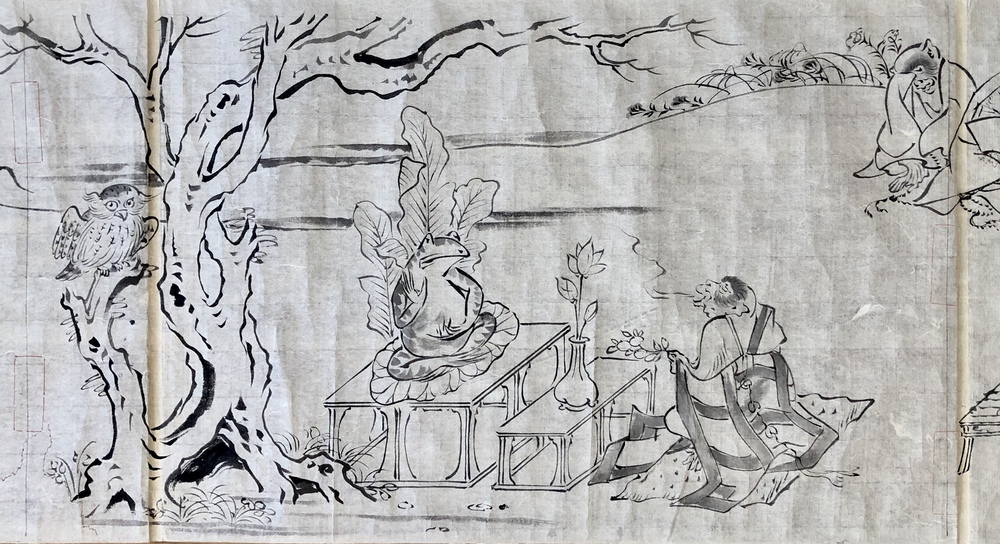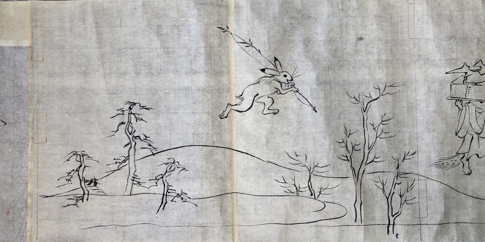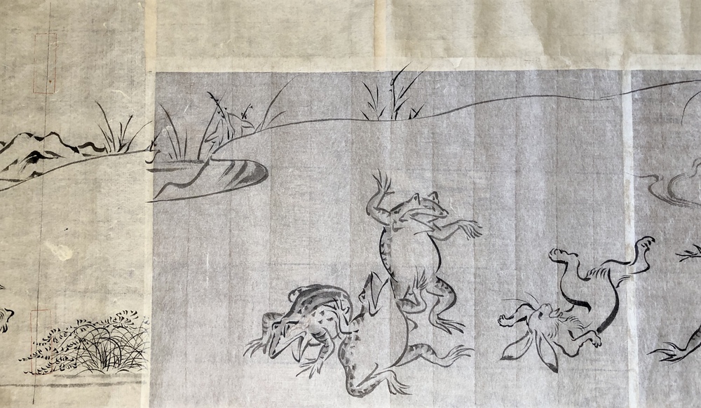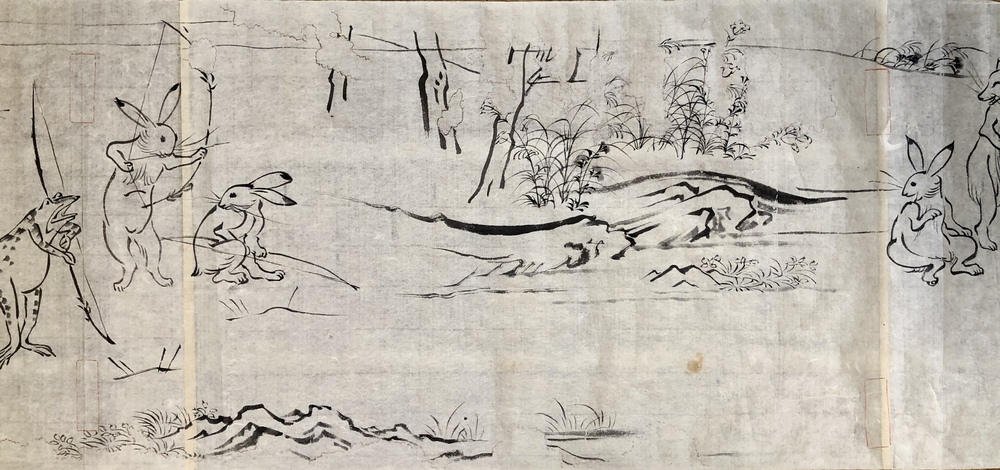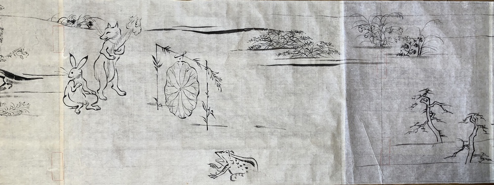 この巻物は、あまりにも有名な高山寺所蔵「鳥獣戯画」甲本を明治19年3月に模写したという模本です。模写した人物として署名されているのは、幕末から明治期にかけて活躍した前田貫業という絵師です。前田貫業は、大和絵に優れた絵師である山名貫義の弟ですが、山名は、1879年に古画の模写の依頼を受けて以来、正倉院の宝物調査、各地の寺社の宝物調査に従事するなど、明治期の古美術調査、保存、継承に尽力したことでも知られています(山名の来歴については、高階秀爾監修『絵画の明治:近代国家とイマジネーション』毎日新聞社、1996年を参照)。この兄との関係で、何らかの調査目的で、前田貫業が模写を行った可能性もありますが、正確な背景事情は分かりません。 「鳥獣戯画」は、1872年のいわゆる「壬申検査」と呼ばれる宝物調査でその重要性が再認識され、その後に修復、山崎董詮による模写がなされています(壬申検査については、東京国立博物館での2015年の特別展示「鳥獣戯画と高山寺の近代-明治時代の宝物調査と文化財の記録-」の解説を参照)。本図が、この時の模写をもとにした更なる模本であるのか、あるいは原本に基づく模本であるのかどうかはわかりませんが、いずれにしても原本に近い大きさで描かれていることから、いずれかの手本を元に描かれたことは間違いなさそうです。 ただし、本来の第十一紙から第十七紙に相当する場面については、一部のアレンジがみられることから、忠実な模本とはやや異なるように見受けられます。このアレンジがなされている箇所は、他の箇所と異なる用紙で継がれている箇所に概ね相当しますので、画家による任意のアレンジというよりも、用紙という物理的制約に基づくものかもしれませんが、なぜこのような用紙の違いが生じているのかについては、やはり不明のままです。 本図は2年ほど前にドイツのオークションで、他の洋古書に混じって表題も絵師の名前も明記されずに競売にかけられていたもので、なぜ、いつ頃、どのような事情で、ヨーロッパに渡っていたのかについても全く不明です。本図は、本来当店で扱うような文献とは性質がやや異なるため、その正確な価値については、店主には計りかねるところがありますが、単なる余興や贋作として制作されたものとも考えにくいため、どのような目的で制作されたのかという背景事情も含めて、何らかの歴史史料としての価値を有するものなのかもしれません。