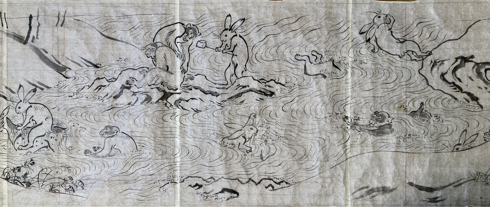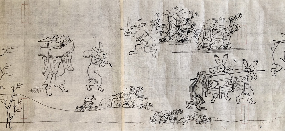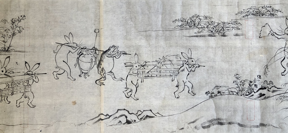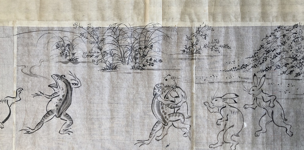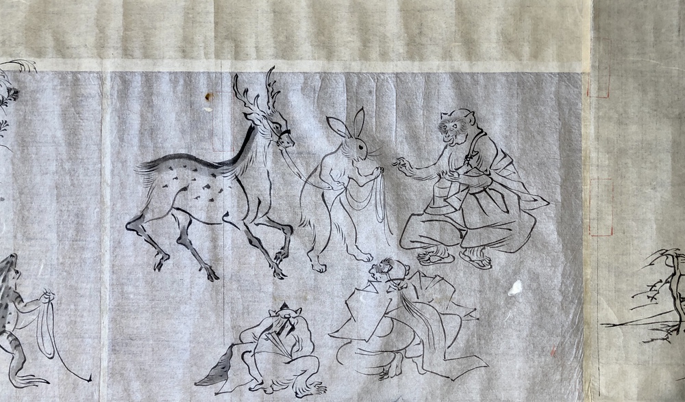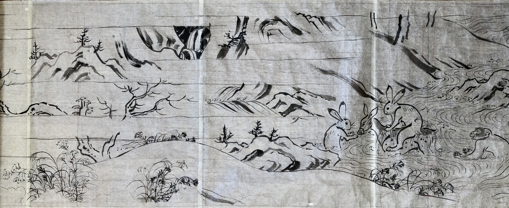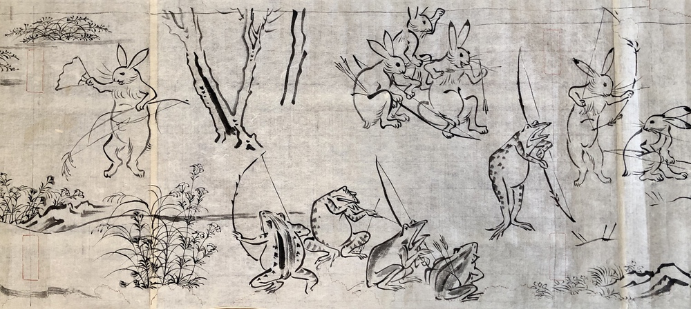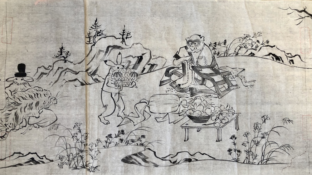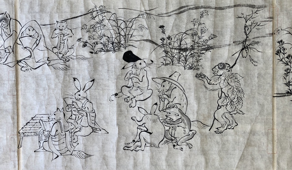 この巻物は、あまりにも有名な高山寺所蔵「鳥獣戯画」甲本を明治19年3月に模写したという模本です。模写した人物として署名されているのは、幕末から明治期にかけて活躍した前田貫業という絵師です。前田貫業は、大和絵に優れた絵師である山名貫義の弟ですが、山名は、1879年に古画の模写の依頼を受けて以来、正倉院の宝物調査、各地の寺社の宝物調査に従事するなど、明治期の古美術調査、保存、継承に尽力したことでも知られています(山名の来歴については、高階秀爾監修『絵画の明治:近代国家とイマジネーション』毎日新聞社、1996年を参照)。この兄との関係で、何らかの調査目的で、前田貫業が模写を行った可能性もありますが、正確な背景事情は分かりません。 「鳥獣戯画」は、1872年のいわゆる「壬申検査」と呼ばれる宝物調査でその重要性が再認識され、その後に修復、山崎董詮による模写がなされています(壬申検査については、東京国立博物館での2015年の特別展示「鳥獣戯画と高山寺の近代-明治時代の宝物調査と文化財の記録-」の解説を参照)。本図が、この時の模写をもとにした更なる模本であるのか、あるいは原本に基づく模本であるのかどうかはわかりませんが、いずれにしても原本に近い大きさで描かれていることから、いずれかの手本を元に描かれたことは間違いなさそうです。 ただし、本来の第十一紙から第十七紙に相当する場面については、一部のアレンジがみられることから、忠実な模本とはやや異なるように見受けられます。このアレンジがなされている箇所は、他の箇所と異なる用紙で継がれている箇所に概ね相当しますので、画家による任意のアレンジというよりも、用紙という物理的制約に基づくものかもしれませんが、なぜこのような用紙の違いが生じているのかについては、やはり不明のままです。 本図は2年ほど前にドイツのオークションで、他の洋古書に混じって表題も絵師の名前も明記されずに競売にかけられていたもので、なぜ、いつ頃、どのような事情で、ヨーロッパに渡っていたのかについても全く不明です。本図は、本来当店で扱うような文献とは性質がやや異なるため、その正確な価値については、店主には計りかねるところがありますが、単なる余興や贋作として制作されたものとも考えにくいため、どのような目的で制作されたのかという背景事情も含めて、何らかの歴史史料としての価値を有するものなのかもしれません。
