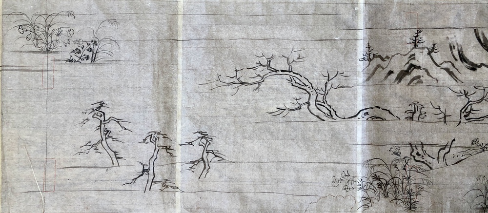 31.6 cm x 1,081 cm, 1 folded roll, 複数の和紙を張り付いで巻物仕立てにしたもの。
