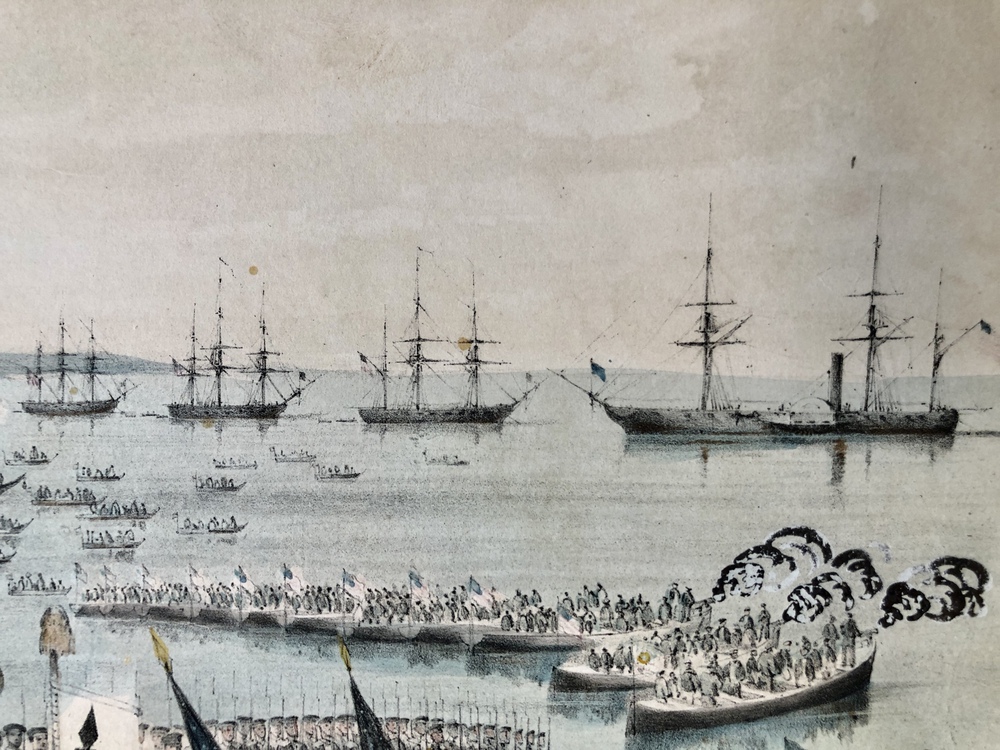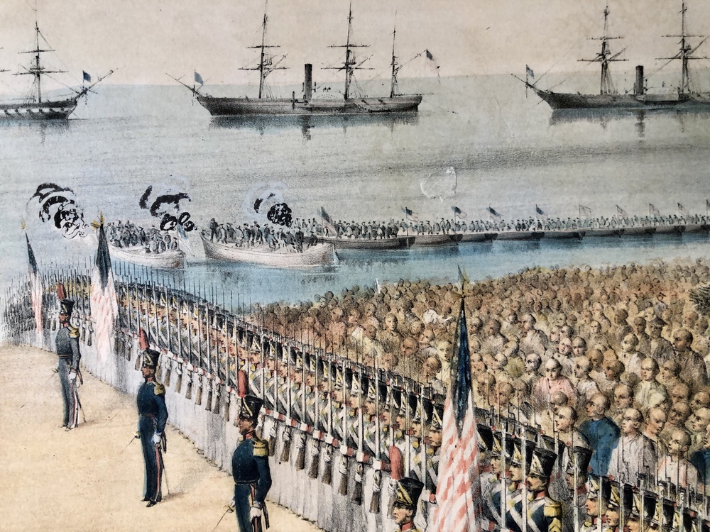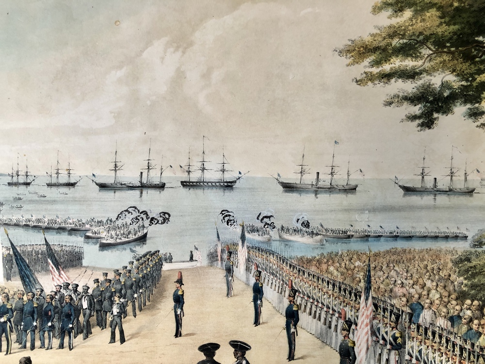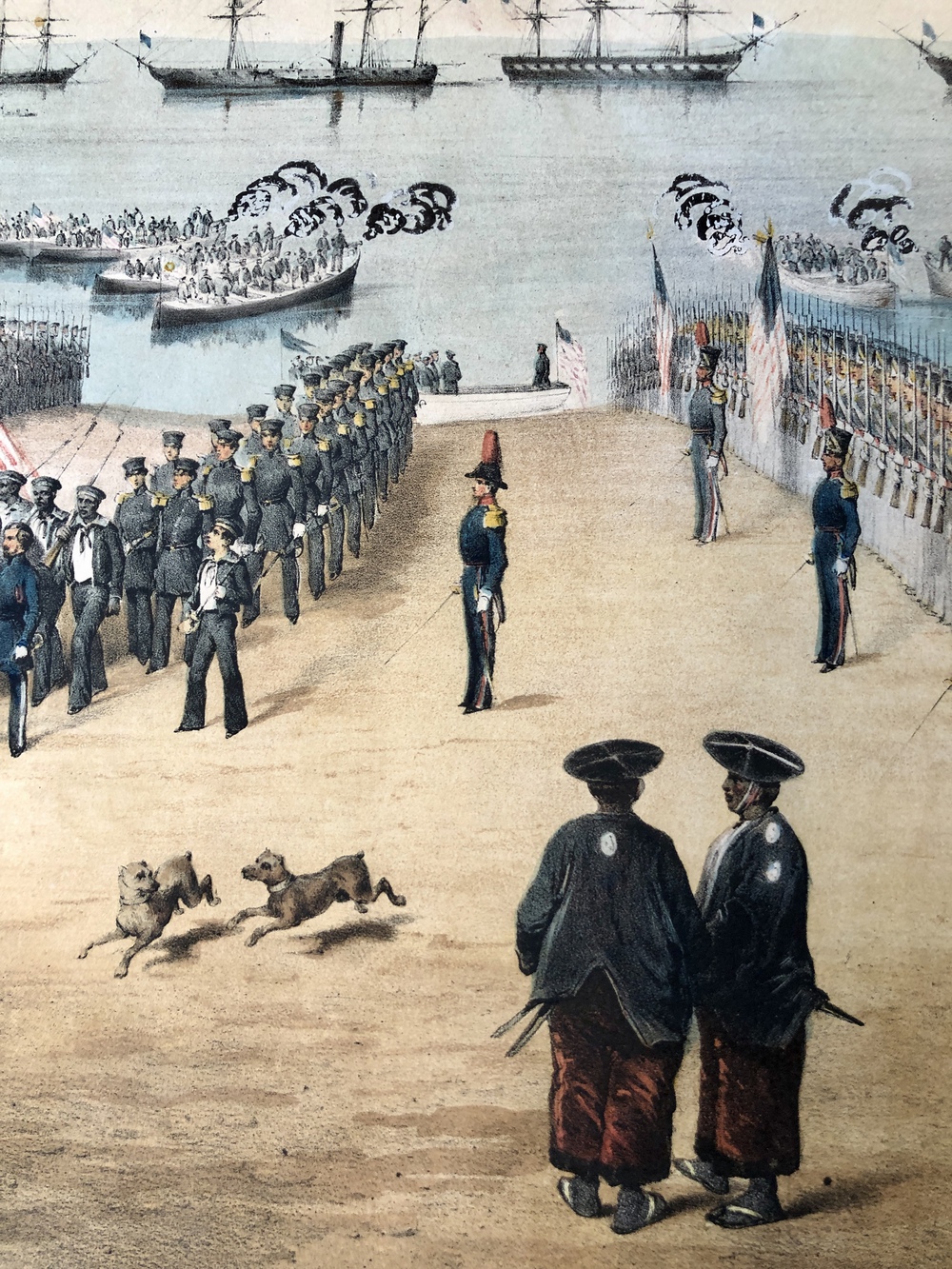 LANDING OF COMMODORE PERRY, OFFICERS & MEN OF THE SQUADRON, TO MEET THE IMPERIAL COMMISSIONERS AT YOKU-HAMA, JAPAN MARCH 8TH 1854. To Commodore M. C. Perry, Officers of men of the Japan Expedition...