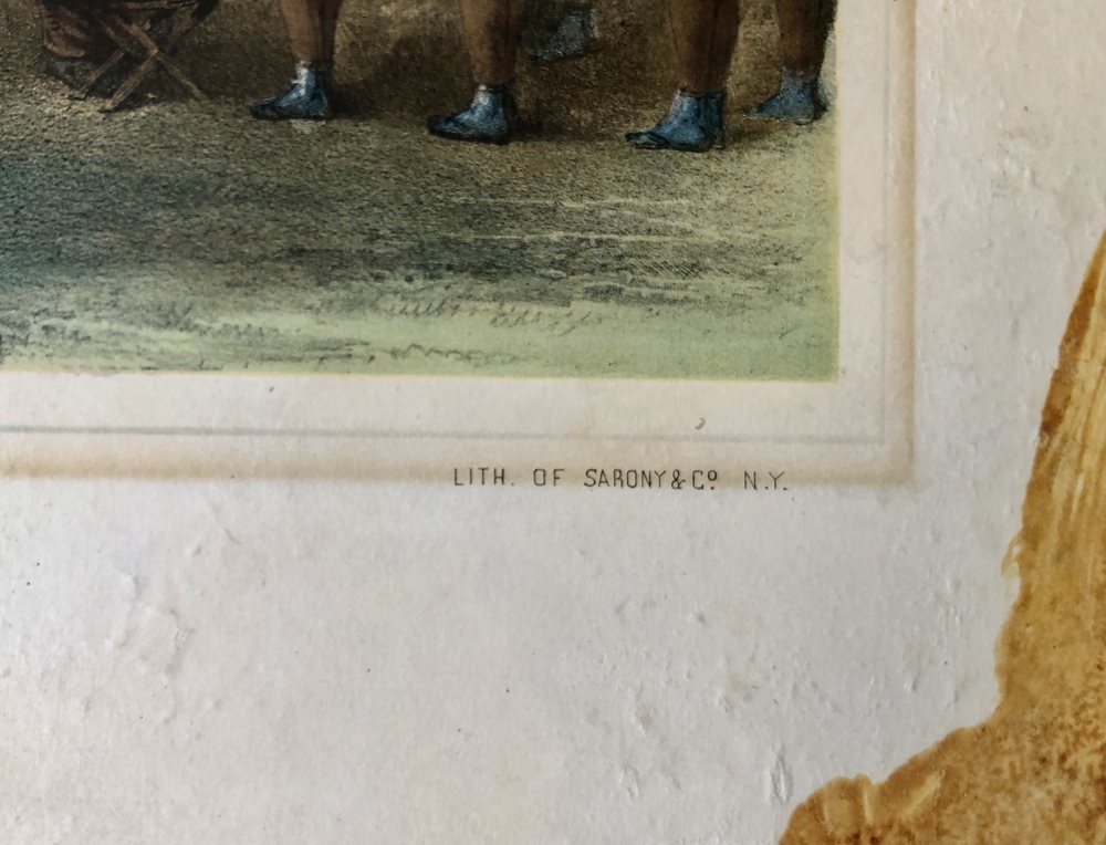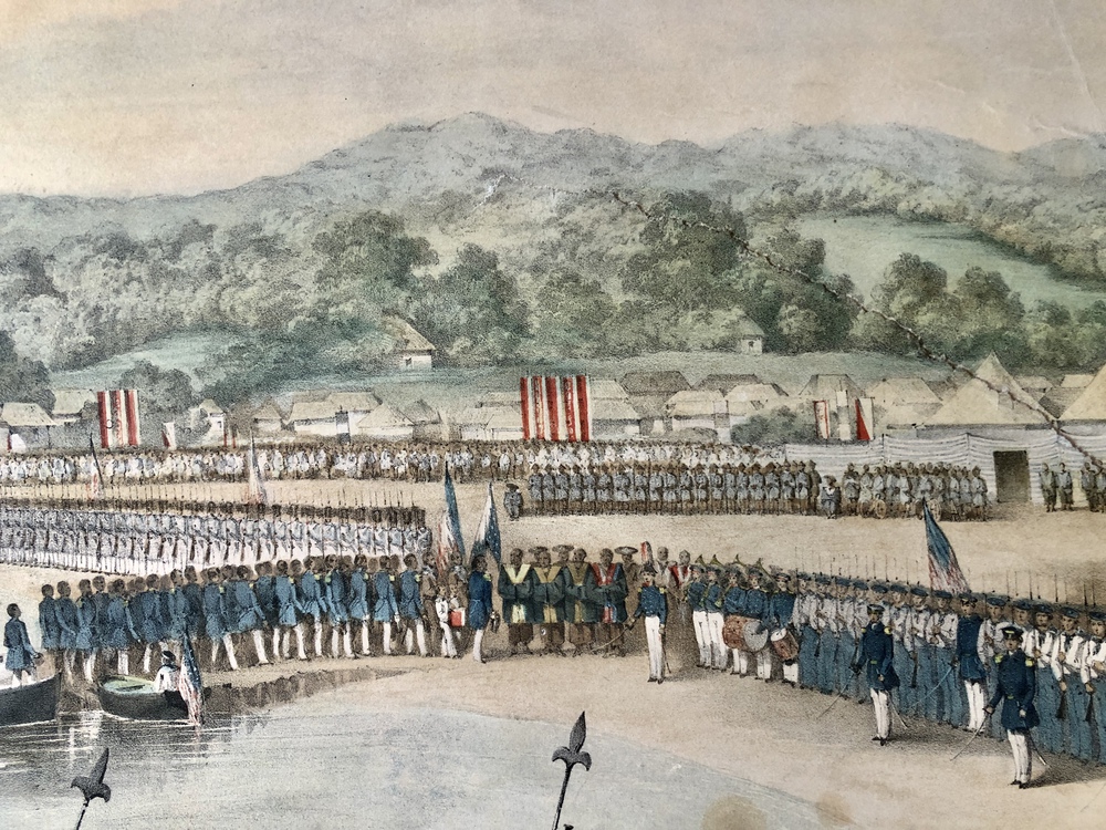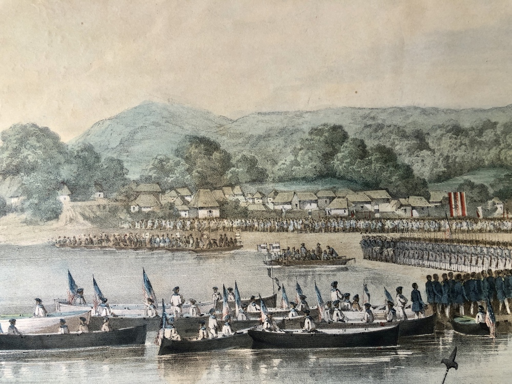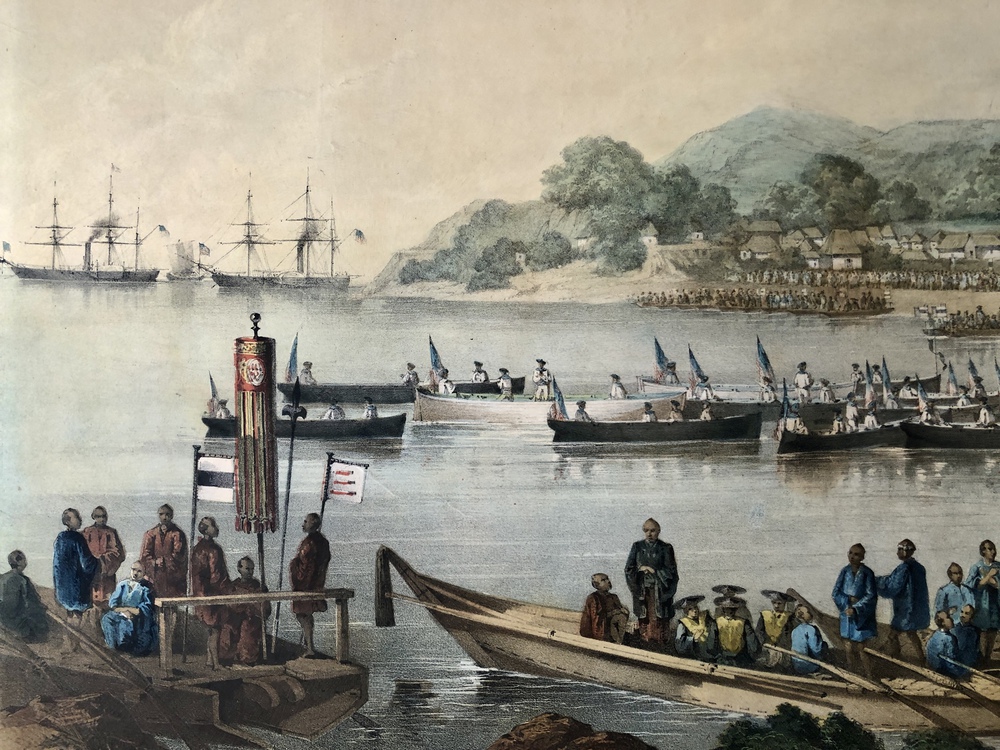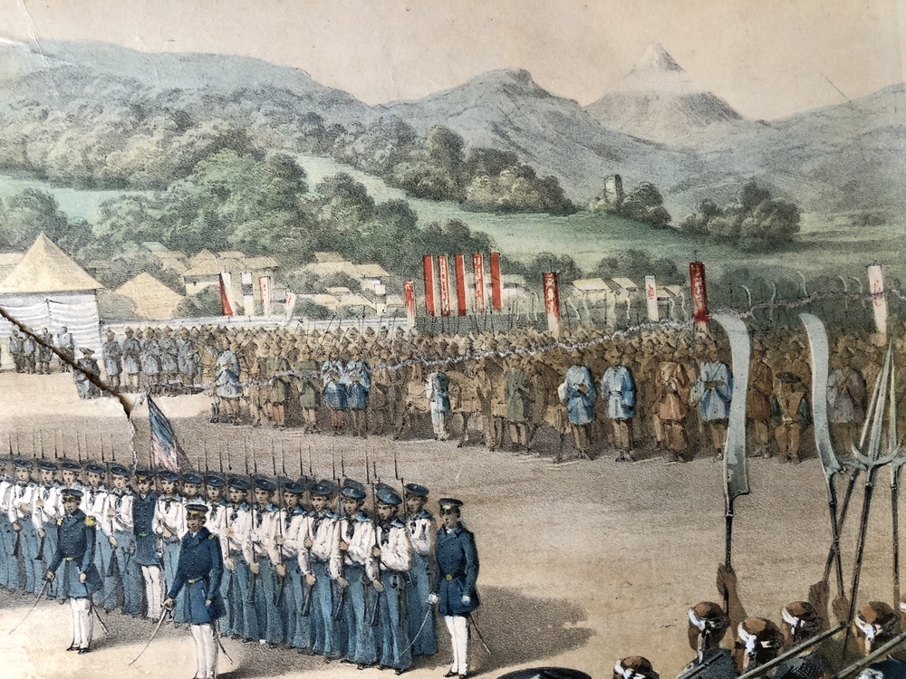 このように非常に貴重な本作品ですが、日本国内の研究機関においては、店主の知る限りでは印刷博物館が本作品を含む『日本遠征図集』全6作品を、また、横浜開港資料館と江戸東京博物館が「横浜上陸図」とともに所蔵していることが確認できます。これ以外に一体どれだけの所蔵機関があるのかについては、不明ですが公式記録である『日本遠征記』、ハイネの『日本遠征石版画集』と比べても著しく少ないのではないかと思われます。その意味でも、本図は非常に貴重で重要な一枚ということが言えるでしょう。