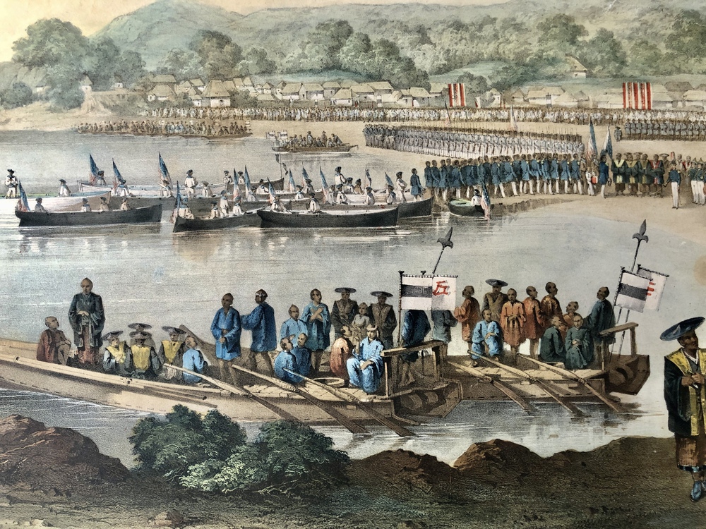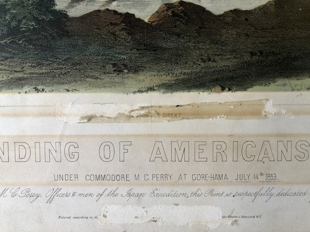 本作品も、Entered according to Act of the Congress in the year 1855 by Heine & Brown in the Clerk’s Office of the District Court of the Southern District of New York. と記されていることからもわかるように、ブラウン・ジュニアがペリーと議会の許可を得た上で1855年に刊行されたものですが、そのサイズがべらぼうに巨大、かつ細部は極めて精密に描かれている、他の出版物とは一線を画した異色の作品です。『日本遠征記』も四つ折り版 (約22 cm x 30 cm)と立派な書物で、多くの彩色リトグラフを収録した非常に豪華な出版物として知られ、先に述べたハイネの『日本遠征石版画集』も約51 cm x 37 cm という大型の彩色リトグラフ集でしたが、本作品は、約67 cm x 94 cmという規格外のサイズを誇っています。これだけ巨大なリトグラフを制作するためには、原画であるハイネの水彩画を石版の原版に落とし込み、それを印刷、さらに精密な手彩色を施すという、途轍もない技術とコストを必要とするため、当時の印刷技術力としての限界に挑戦するような試みだったのではないかと思われますが、本作品の出来栄えと圧倒的な迫力を見る限り、その試みは大きな成功を収めたということができるでしょう。
