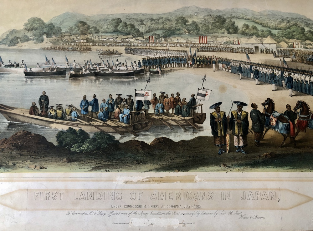 本作品は、ペリー(Matthew Calbraith Perry, 1794-1858)による日本遠征における1853年7月14日の久里浜上陸の場面を描いたものです。「アメリカ人の最初の日本上陸(First landing of Americans in Japan)」と誇らしげに謳われたタイトルが示すように、ペリー艦隊が江戸湾侵入という強硬な手段を用いて、幕府への親書受け取りを迫ったことに対して、武力衝突の回避を重んじた幕府が久里浜において浦賀奉行による親書の受け取りを受諾し、7月14日にペリーらは久里浜に上陸し、「アメリカ人の最初の日本上陸」を果たしたのでした。本作品は、このアメリカにとって記念すべき瞬間を主題にしたもので、遠征隊に随行した画家ハイネ(Wilhelm Heine, 1827 - 1885)による水彩画をもとにして、同じく遠征隊に随行した写真家で優れた石板印刷(リトグラフ)技師であったブラウン・ジュニア(Eliphalet M. Brown, Jr., 1816 - 1886)が彩色リトグラフで製作した作品です。ペリーによる日本遠征を描いた印刷作品として最大のもので、遠征を記念してペリーと士官のためにわずか100部のみが制作されたことが記録されていて、極めて有名な作品である一方で、現在では入手が著しく困難な作品としても知られる貴重な一枚です。